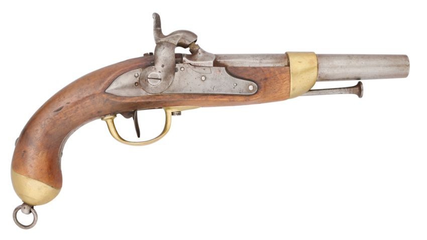 of regulation pattern, with plain barrel dated and struck with marks at the breech, flat bevelled lock, figured half-stock with rounded butt and stamped with circular arsenal mark and inspector’s marks on the side-flat, copper alloy and steel mounts stamped with inspector’s marks and including pommel-cap with suspension ring, barrel band linked to the side-plate, steel ramrod serial numbered to the pistol, 20.0 cm barrel