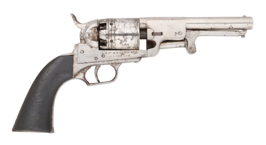 with round barrel, cylinder with turned lines at the rear, frame (action defective) engraved ‘K:K:P: MASCH:FARB’ above ‘INSBRUCK’ on one side, and ‘PATENT 1849’ on the other, rammer and rounded grips (one with minor old split, old rust patination, wear and polished bright), 13.7 cm barrel