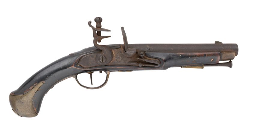 of regimental type, with russet sighted barrel and bevelled lock, the latter with crowned ‘GR’ and ‘TOWER’ across the tail and retained by three side-nails, ebonised full stock (some old wear and minor chips at the pommel spurs) with apron around the barrel tang, copper alloy mounts comprising slender waved side-plate, flattened bluntly spurred pommel, trigger-guard with rounded finial, ramrod-pipe and iron ramrod (iron parts with surface rust patination), 20.8 cm barrel