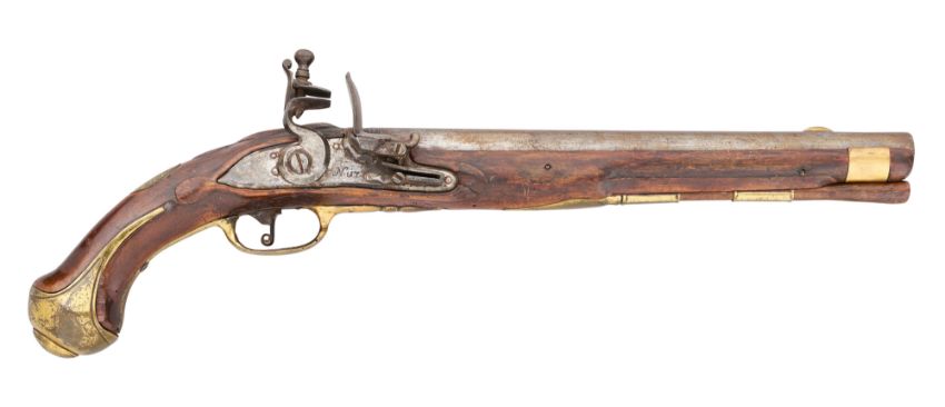 with russet barrel struck with a mark at the breech, tang engraved ‘No.17’, bevelled lock engraved ‘N. 17’, moulded figured full stock (some old bruising, chipped around the pommel and in front of the lock), copper alloy mounts including bevelled side-plate, escutcheon engraved with a coat-of-arms within bound laurel, spurred trigger-guard with cap, facetted ramrod-pipes and wooden ramrod, 33.3 cm barrel