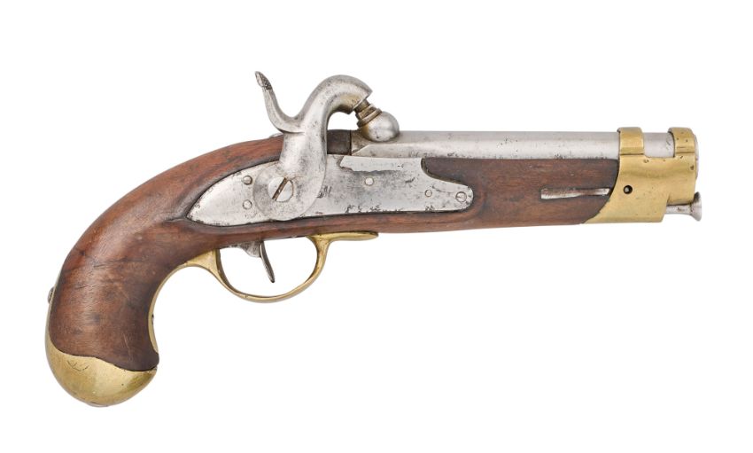 of regulation type, with bright barrel and flat bevelled lock, the latter engraved with ‘GM’ monogram, figured full stock with rounded butt and stamped with indistinct numbers, copper alloy mounts including spring-held muzzle mount also forming the ramrod-entry and associated iron ramrod (some old wear and rust patination), 13.0 cm barrel