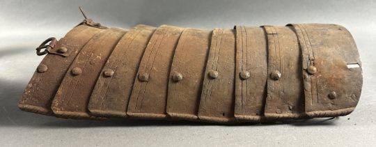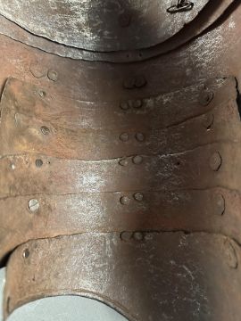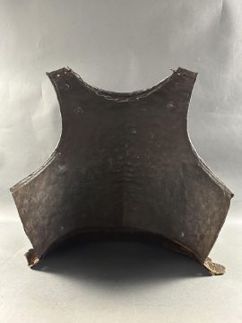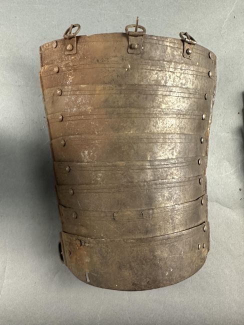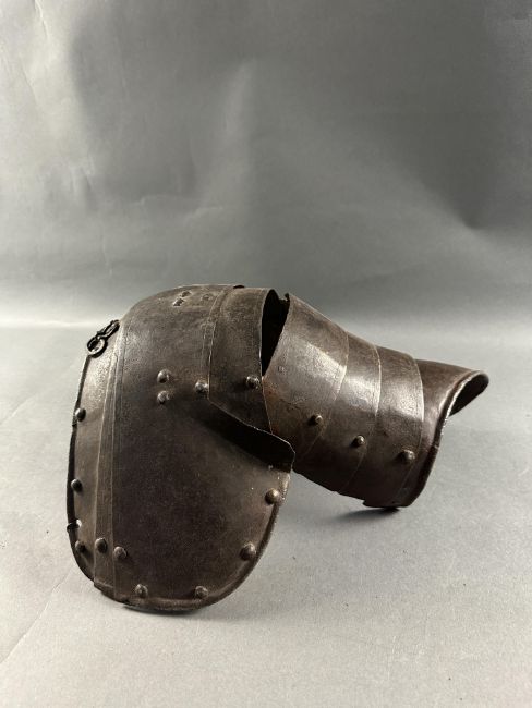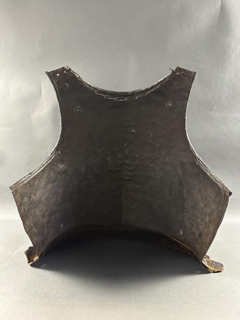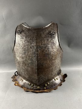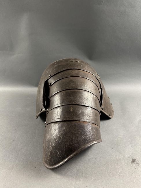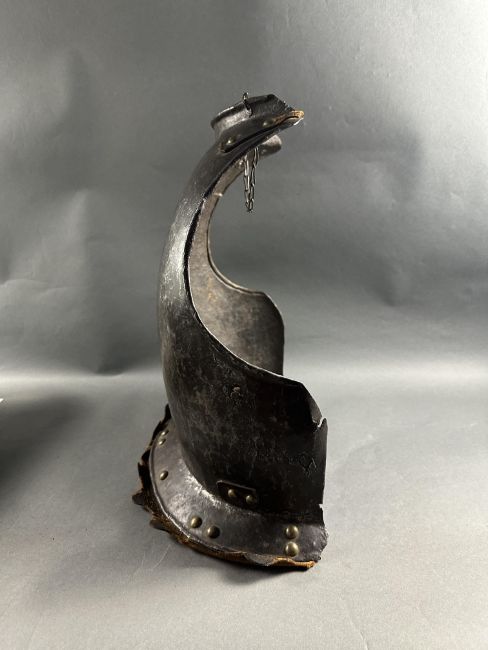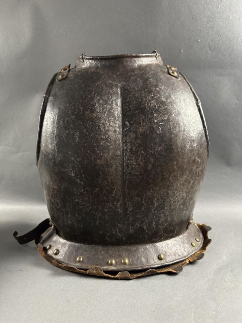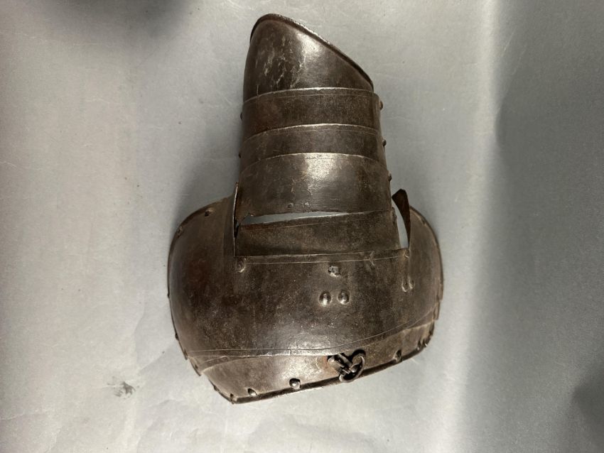 comprising Italian morion in the 'Spanish' fashion formed in one piece with a rounded almond-shaped crown rising to a slight 'stalk', and a flat integral brim projecting to an obtuse point front and rear (bent downwards at the front), pierced with a later wiring-hole, its edge formed with a plain inward turn, the base of the crown encircled by fourteen round-headed lining-rivets with copper alloy washers (two washers missing, one incomplete), the surface of the helmet retaining much of a rough from the hammer finish; South German medially-ridged one-piece breastplate of late peascod fashion, flanged outwards at its base, roped inward turn at the neck and arm-openings, engraved with pairs of lines at the arm-openings and a 'V' over the neck-opening, struck with Nuremburg city mark twice and the letter 'N', fitted with single-end iron buckle at each of the shoulders and two at the waist, well-shaped closely matching backplate engraved with pairs of lines at the neck, symmetrical Italian pauldrons of three broad upper lames and five narrower ones beneath them (some disarticulation), two Italian tassets each of nine lames (restorations), one painted 'GP' for Giocco del Ponte on the inside (areas of rust)
