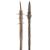 the first formed of ten iron spikes set into a rudimentary wooden haft (wormed); the second with bulbous head fitted with an iron collar with two spikes (four missing), and leaf-shaped terminal blade, on a wooden haft (2)