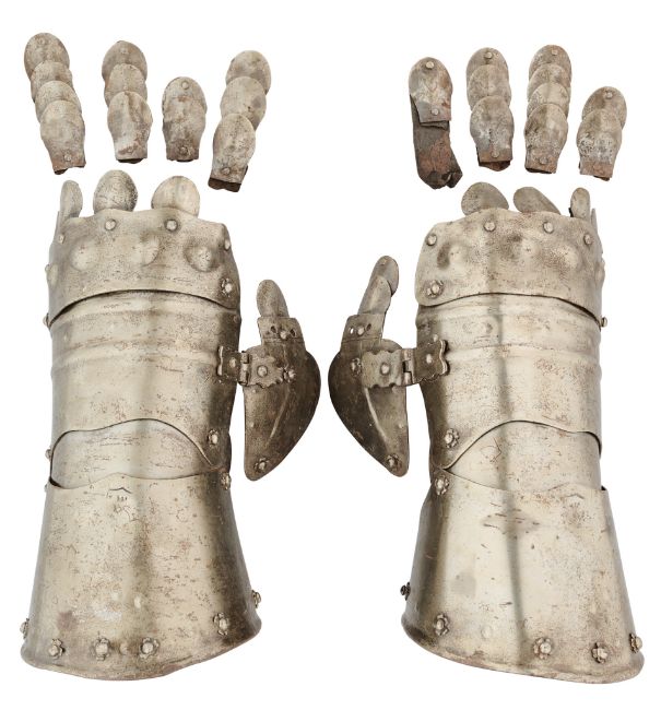 each formed of a slightly flared cuff with fixed inner plate and struck on the top with a mark, two metacarpal-plates, a knuckle-plate embossed for the knuckles and hinged thumb plate (fingers detached, losses), 24.7 cm (2)