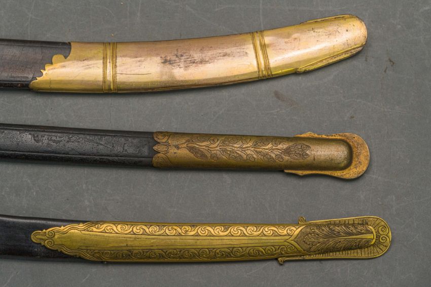 the first for a sword of 1803 infantry pattern or similar, of leather with gilt coper alloy mounts comprising chape, middle-band and locket, the latter inscribed ‘Salter, Sword Cutler to H.R.H. The Duke of Sussex, 35 Strand London’; the second of leather with gilt copper alloy mounts cast and chased with stylised flowerheads; the third of leather, with copper alloy locket and chape decorated with foliage and a fouled anchor on the middle-band and the fourth of gilt copper alloy, for a broad curved blade, the first: 78.0 cm (4)