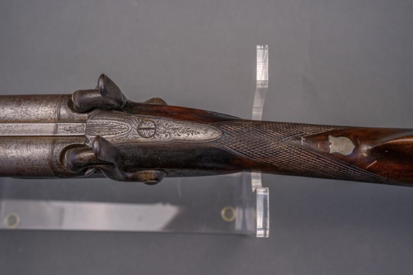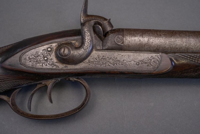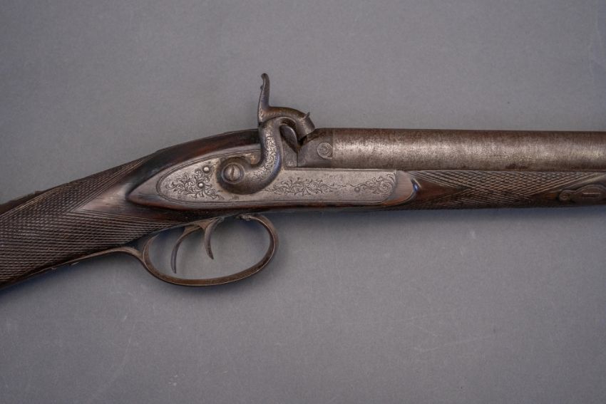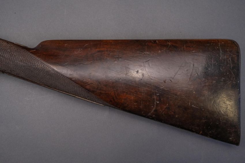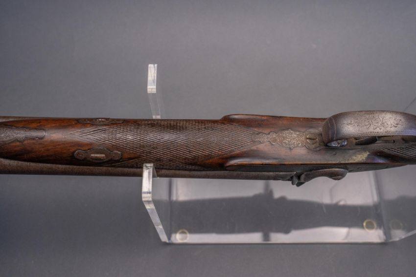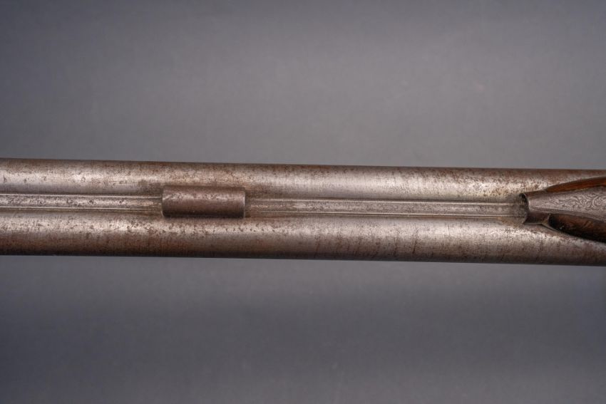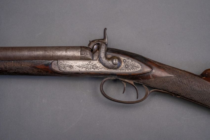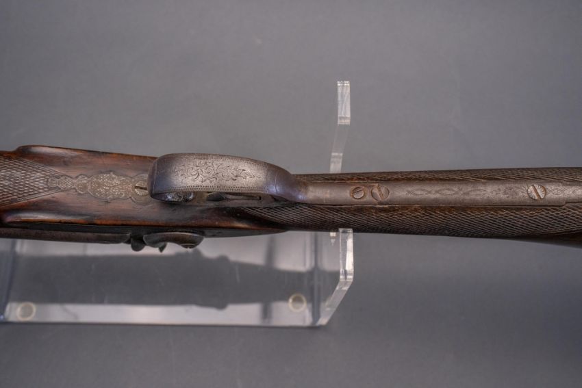 with twist sighted barrels, stamped with the serial number 3184 and the barrelsmith's initials HG beneath, signed scroll-engraved locks (signature rubbed), figured walnut half-stock, chequered fore-end and grip, stamped with the serial number 5017 behind the trigger-guard, and engraved steel mounts (worn throughout, ramrod missing), 67.5 cm barrels