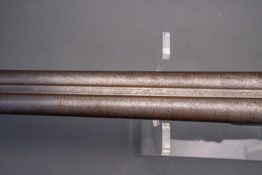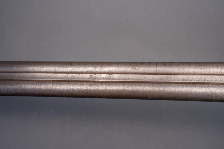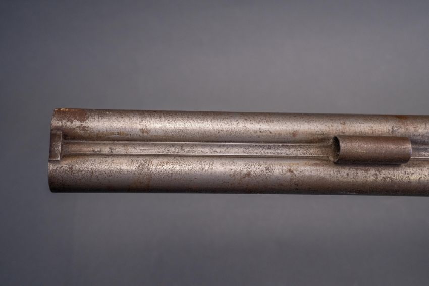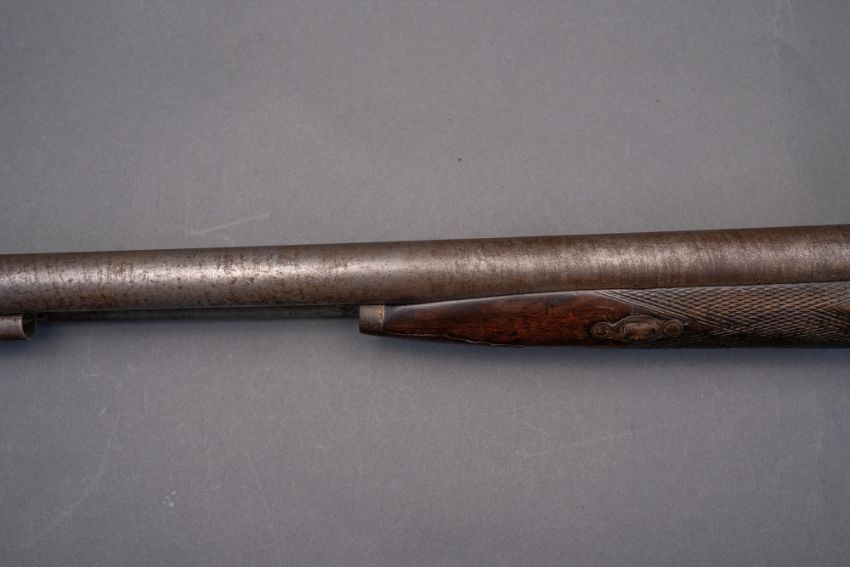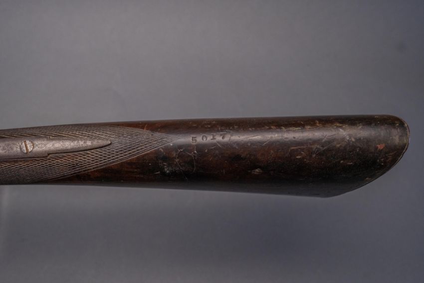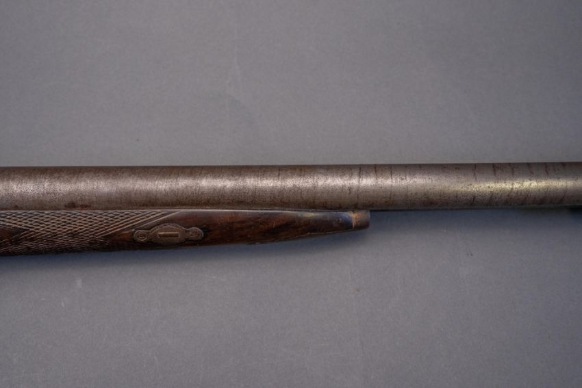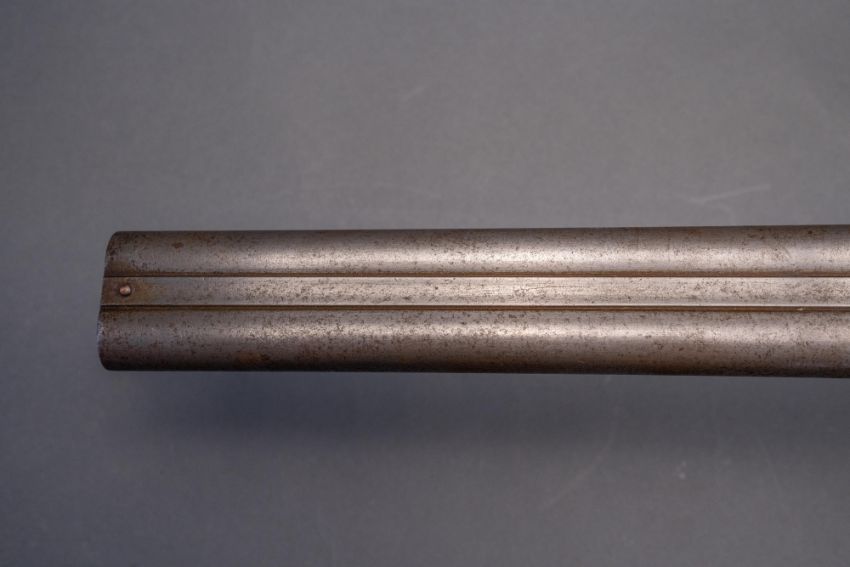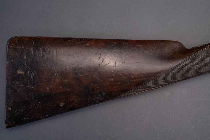 with twist sighted barrels, stamped with the serial number 3184 and the barrelsmith's initials HG beneath, signed scroll-engraved locks (signature rubbed), figured walnut half-stock, chequered fore-end and grip, stamped with the serial number 5017 behind the trigger-guard, and engraved steel mounts (worn throughout, ramrod missing), 67.5 cm barrels