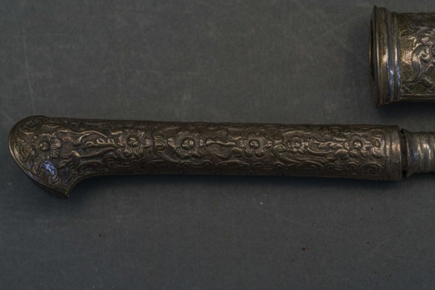 with slightly curved single-edged blade, silver hilt embossed and chased with traditional scrollwork, flowers and foliage, in its matching scabbard decorated en suite, the locket with a single flowerhead on a trellis and the chape formed as a scaly monsterhead, 13.5 cm blade