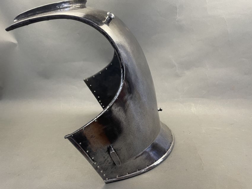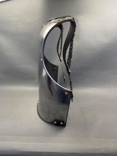 comprising breastplate formed with a medial ridge, struck with a bullet mark on its left, fitted with a pair of studs for the shoulder scales, a hook on each side and a central stud for a belt, and associated backplate, fitted with gilt copper alloy shoulder scales, and the principle edges flanged outwards, 41.0 cm high (2)