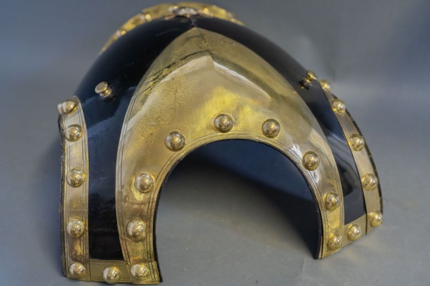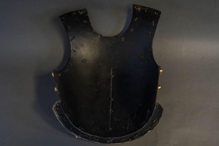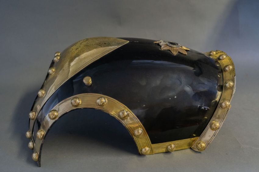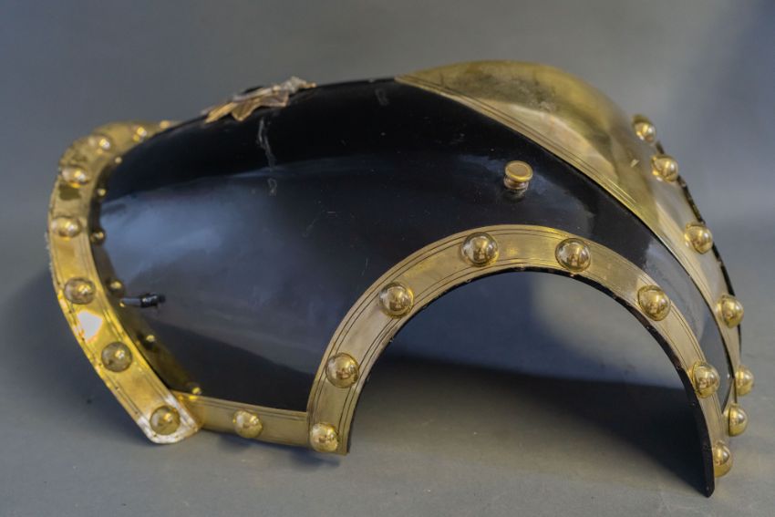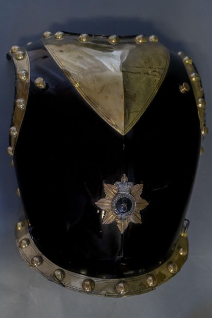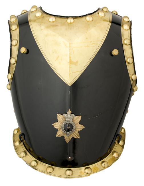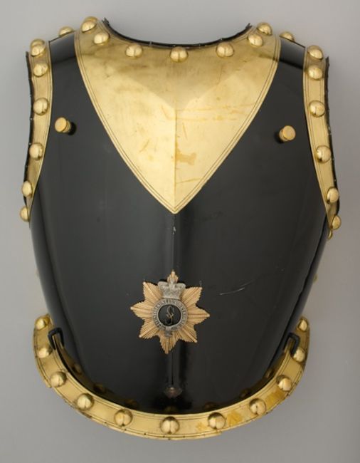 frontal plate only, of black enamelled steel, with shallow medial ridge and integral gilt metal gorget (minor damage to the enamel), the plate edged all round with broad gilt metal strips bearing a row of hemispherical gilt studs, below the gorget, a star with white metal rays, bearing a gilt crown of Victorian pattern above a monogram on black enamel, within a gilt strap inscribed Vestigia Nulla Retrorsum, 47.5 cm high