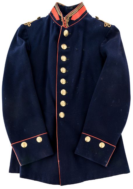with scarlet piping and fine gilt buttons bearing the Imperial Eagle, the collar with scarlet patches and a double row of narrow gold braid, very small shoulder-knots of gold Russia braid
