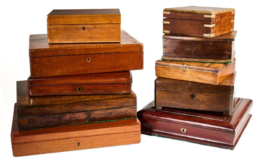 the first with shaped copper alloy escutcheon on the lid, refitted and lined in blue baize; the second with shaped copper alloy escutcheon on the lid, refitted and lined in green baize; the third with shaped copper alloy escutcheon on the lid, refitted and lined in blue baize; the fourth with shaped copper alloy escutcheon on the lid, refitted and lined in blue baize; the fifth with moulded lid with shaped copper alloy escutcheon, refitted and lined in green baize; the sixth, seventh, eight and ninth lined in green baize and the tenth lined in blue green fabric, the first: 34.2 cm x 26.5 cm (external) (10)