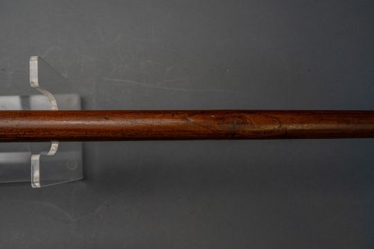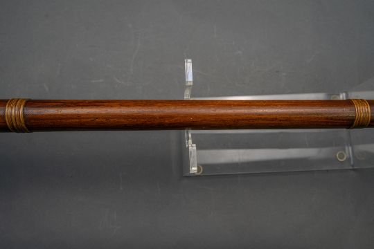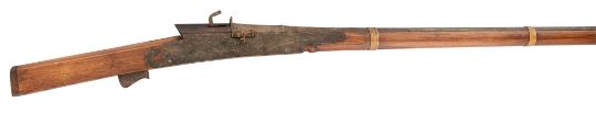 with tapering sighted barrel retained by later rattan bands, vase-shaped muzzle, flared breech fitted with integral pan with picot-cover (bent) and back-sight, action enclosed by a pair of shaped iron plaques pierced with bird's heads at the rear, full stock, slender faceted butt, and iron ramrod, 113.4 cm barrel