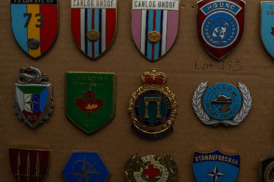 on three cards, containing some 80 Canadian, US and UN badges in white metal and enamel