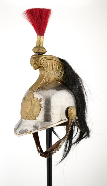 the steel helmet mounted in front with a brass plate bearing the national Sun of May coat of arms of Argentina, the crest with black horsehair mane, Medusa’s Head to front and gadroon decoration to sides, bearing a short upright red horsehair “shaving-brush” plume in a brass socket at the front, brass chin-chain on leather backing (headband and lining absent)