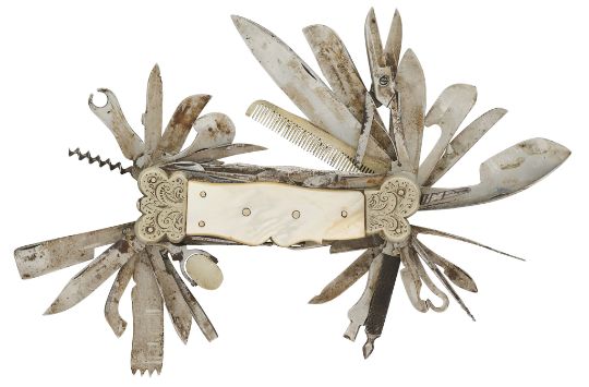 with over forty folding blades and accessories including awls, borers, corkscrews, bodkins, bradawls and fleams, and fitted at each side with a mother-of-pearl scale over German silver fillets with engraved shaped German silver terminals, 12.0 cm (closed)
