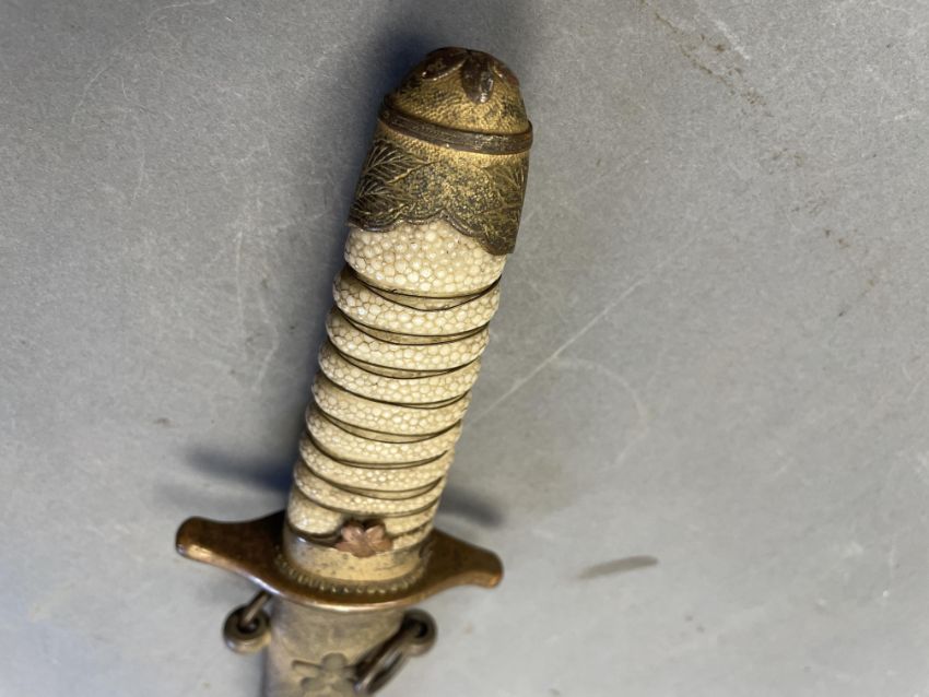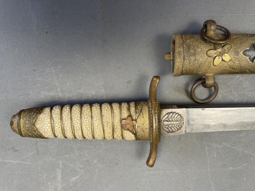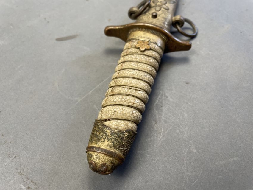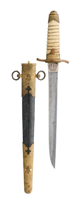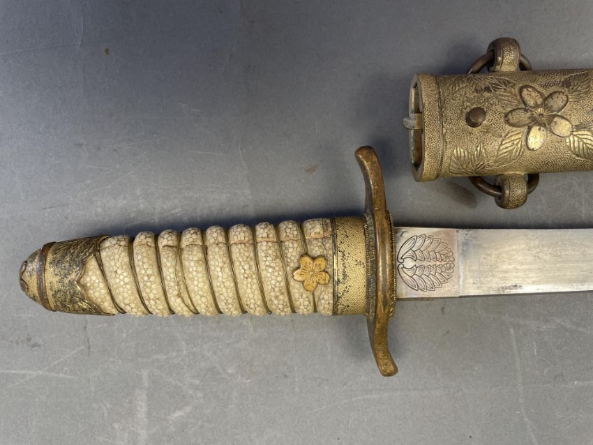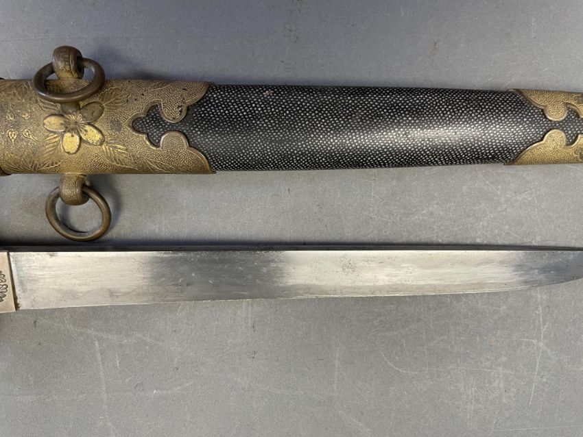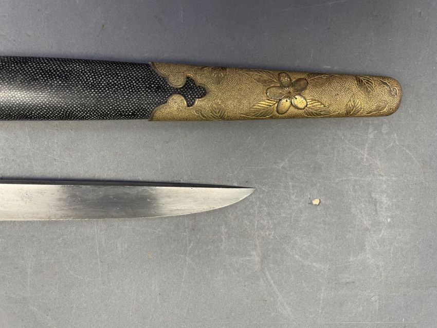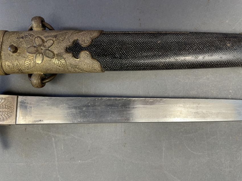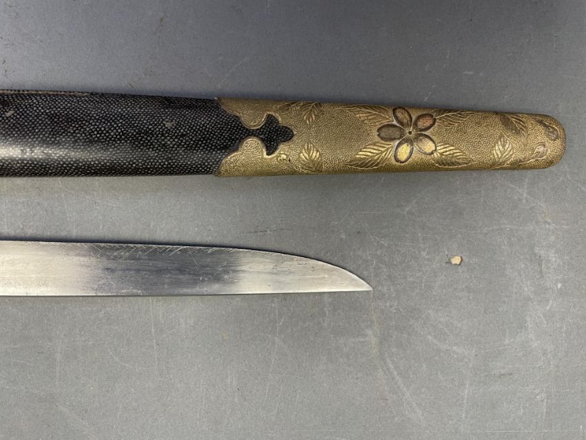 Sugata (configuration): hira zukuri (flat profile with no longitudinal ridge), forging and tempering details mostly obscured by rubbing, silver habaki (collar) with family crest of opposing ginger shoots; nakago (tang) unable to unscrew sakura shaped peg cover Koshirae (mounting): saya (scabbard) of wood covered with fine high quality samegawa (ray skin), brass fittings decorated with sakura (cherry blossom) on a hammered ground; wooden tsuka (hilt) wrapped with coiled samegawa (rayskin)