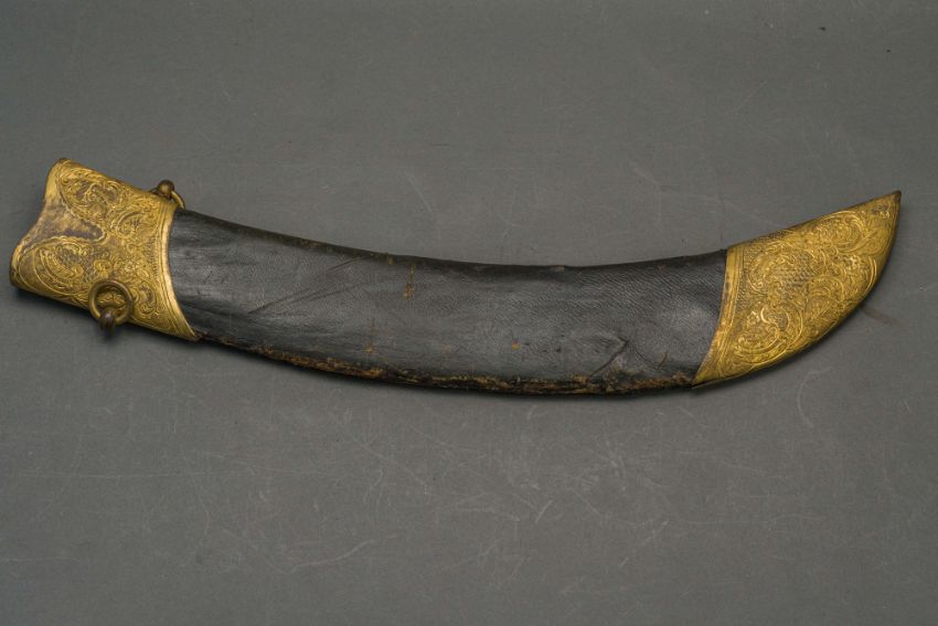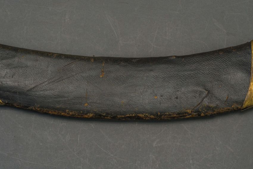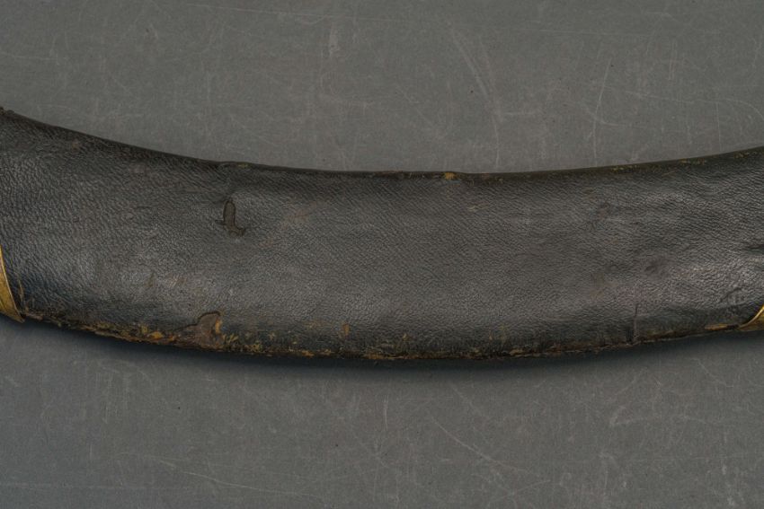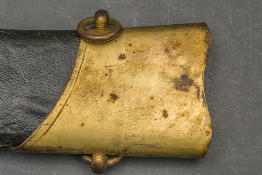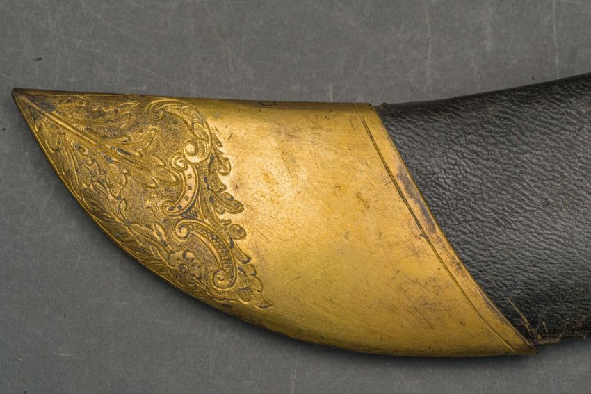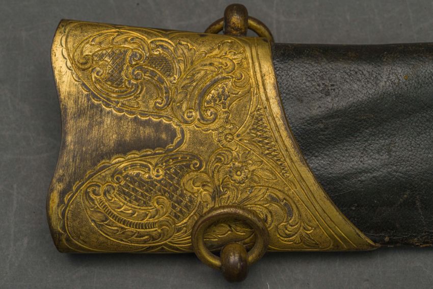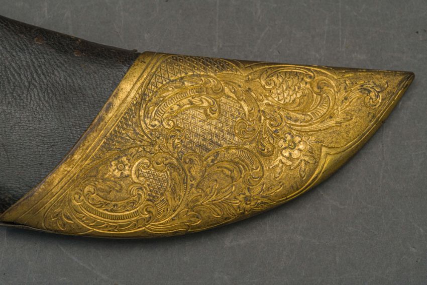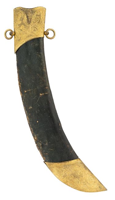 for a very broad shortsword, of leather-covered wood, with large gilt copper alloy locket and chape each engraved with rococo scrolls, flowers, foliage and trellis, the locket with a pair of rings for suspension, and some early gilt finish, 46.8 cm