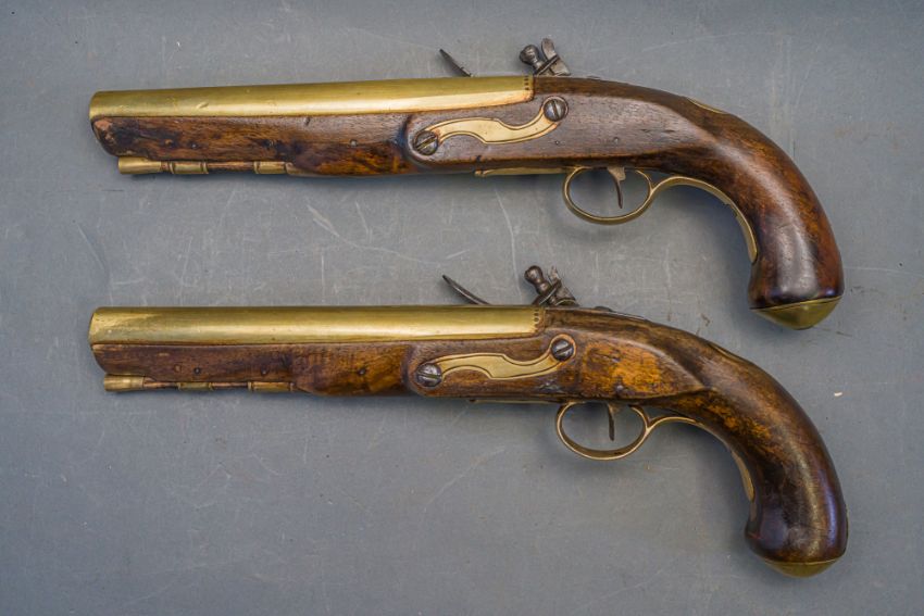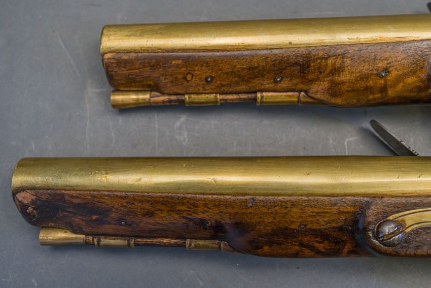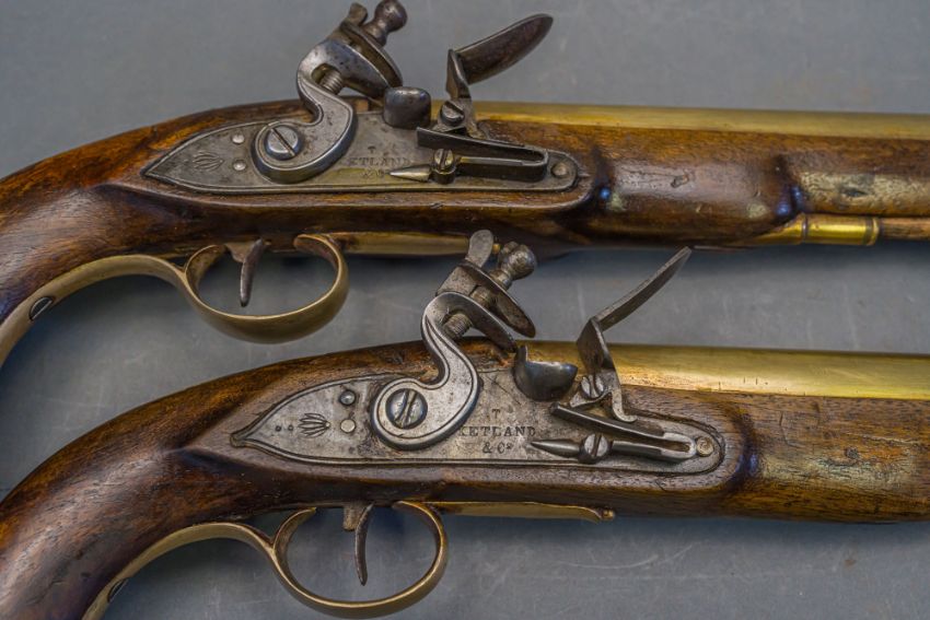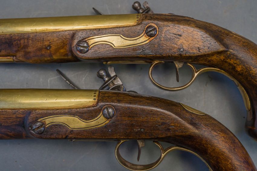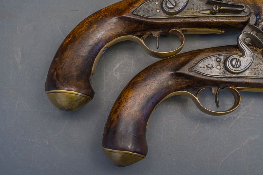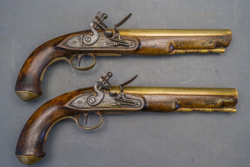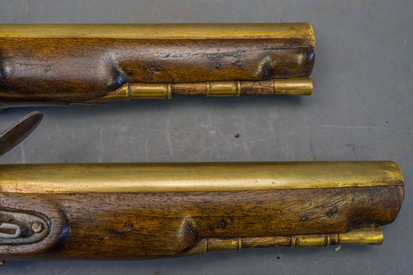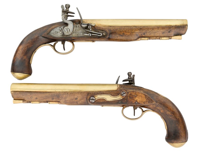 with tapering brass barrels struck with proof marks and inscribed ‘London’ in a linear frame over the breeches (the vents sealed with compound), signed border-engraved lock (cocks replaced), full stocks (repairs) and brass mounts of livery type including butt-caps, flush-fitting side-plates, trigger-guards and vacant escutcheons, and brass-tipped ramrods; in a later lined and fitted case, 22.0 cm (2)