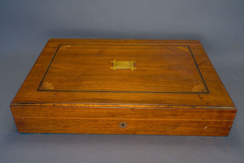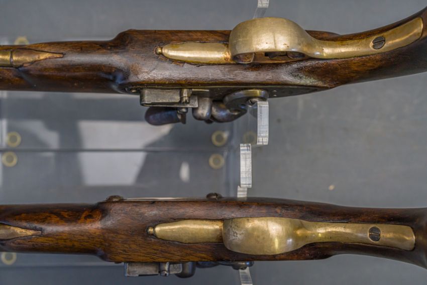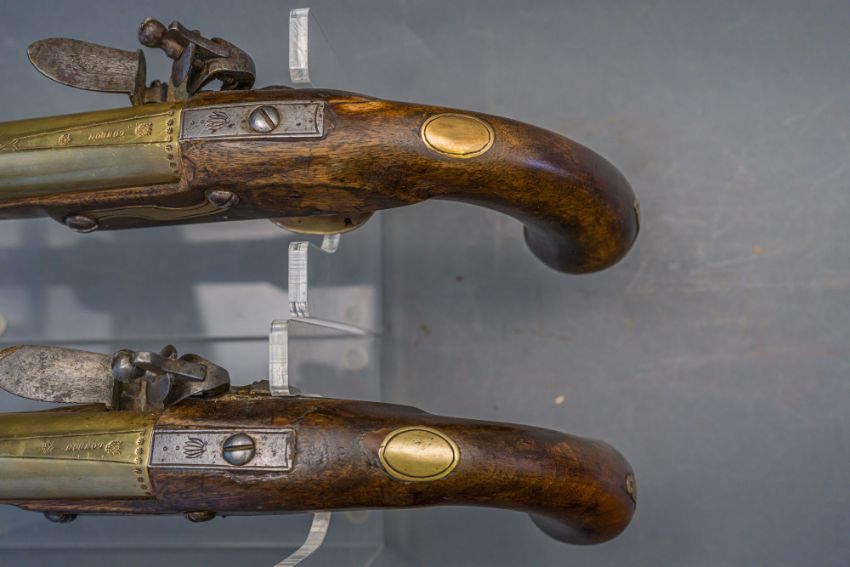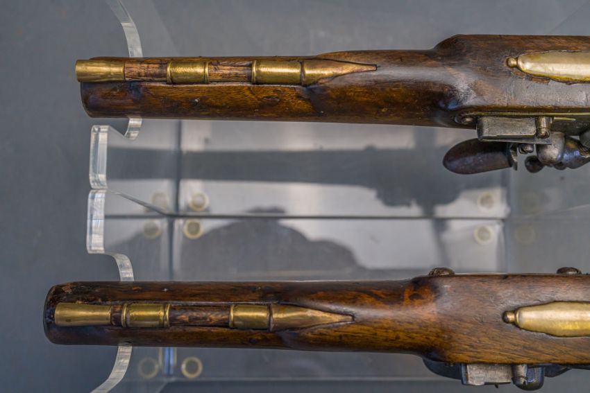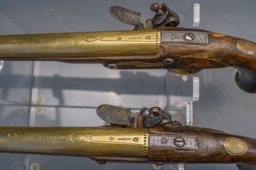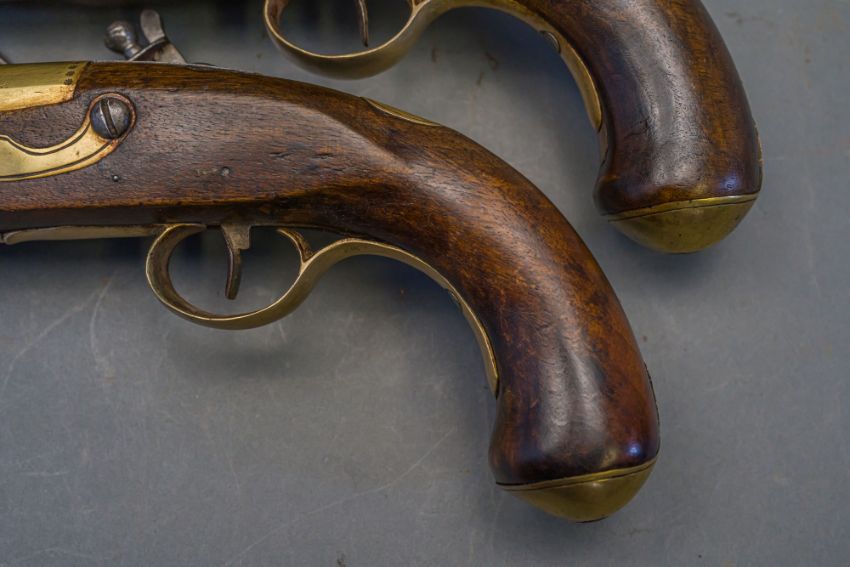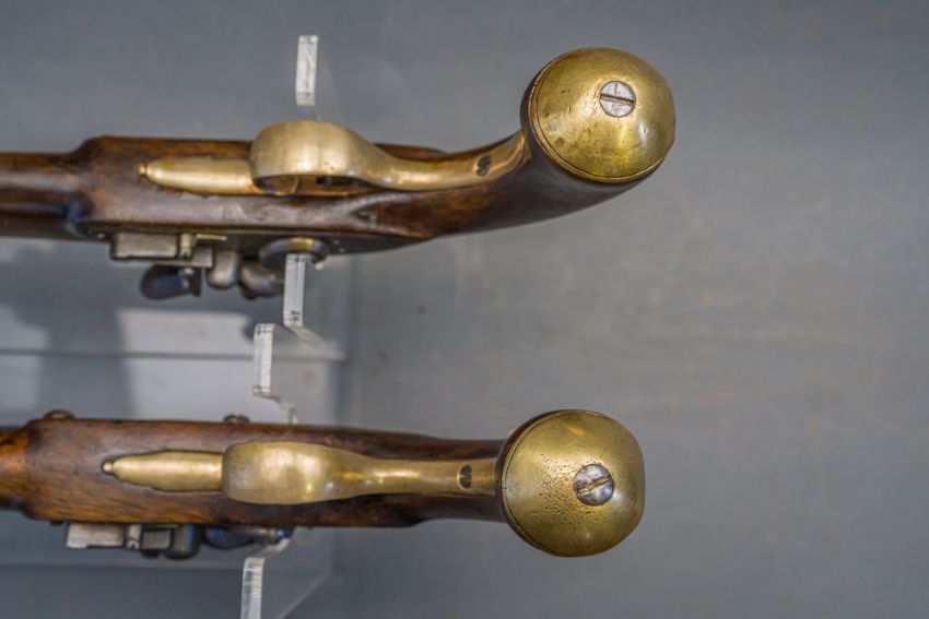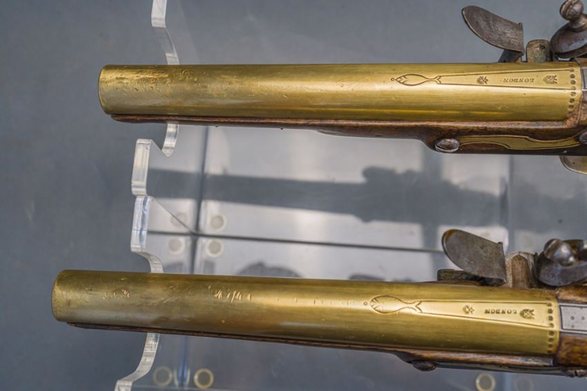 with tapering brass barrels struck with proof marks and inscribed ‘London’ in a linear frame over the breeches (the vents sealed with compound), signed border-engraved lock (cocks replaced), full stocks (repairs) and brass mounts of livery type including butt-caps, flush-fitting side-plates, trigger-guards and vacant escutcheons, and brass-tipped ramrods; in a later lined and fitted case, 22.0 cm (2)