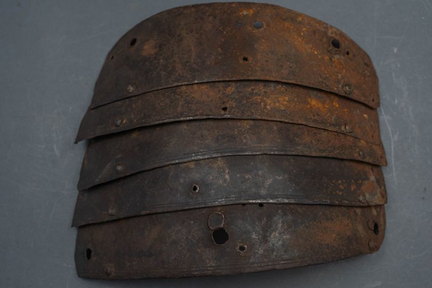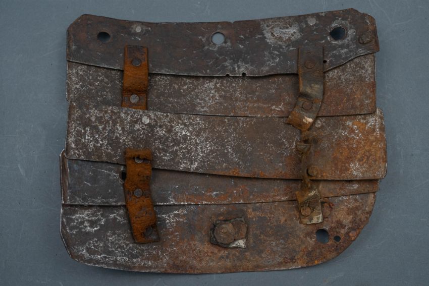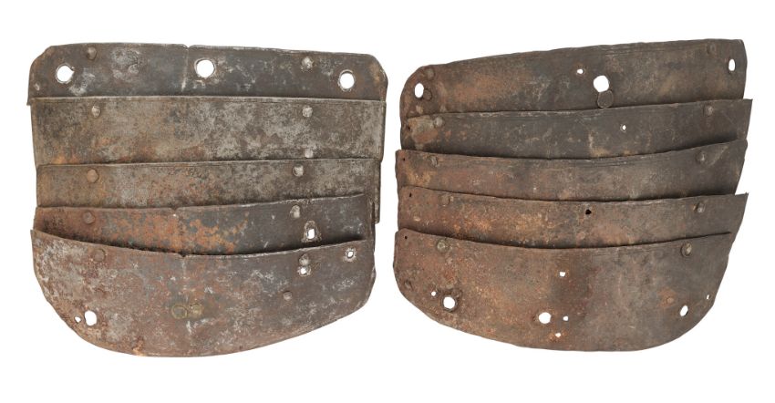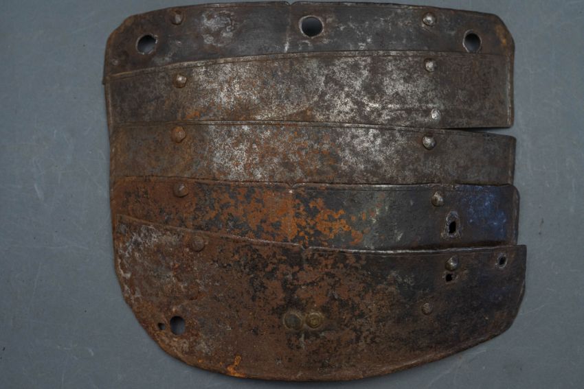 each of five lames, decorated with incised lines at the principle borders (rusted, small holes), 20.3 cm (2)