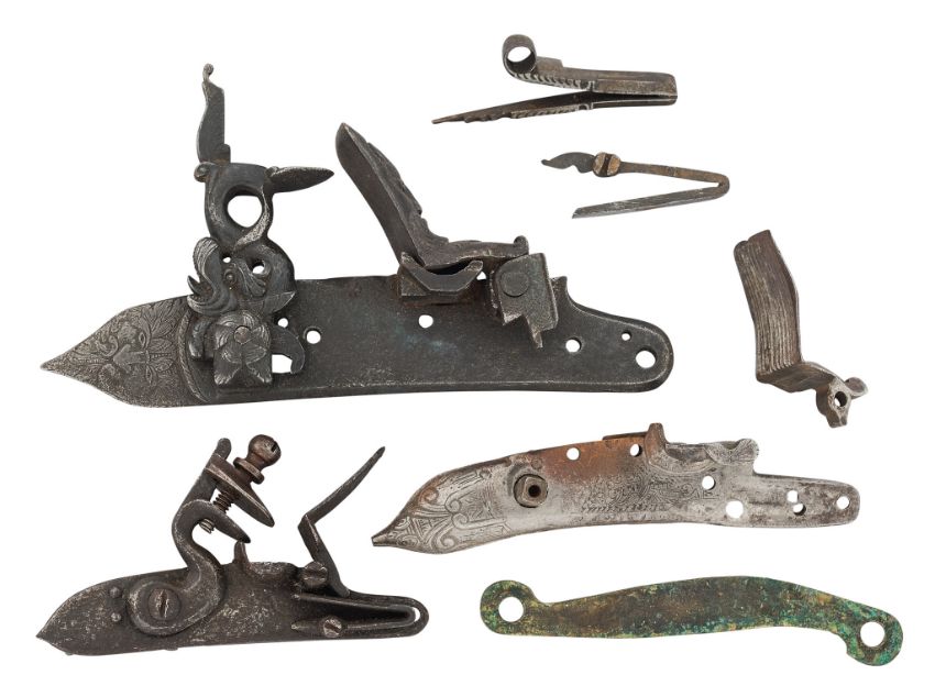 the first inscribed ‘Silvestro’ di Foligno’ (pitted, partly obscured) on the inside, chiselled with a mask on the tail and fitted with pierced and chiselled cock (incomplete, restorations); the second for a pistol (pitted); the third for a Balkan pistol (cock missing), a detached steel, two mainsprings and a side-plate, the first: 16.0 cm (7) A Giovanni Silvestro is recorded in Brecia and Monte di Sansavino, Tuscany, circa 1670. Foligno is an Umbrian town in the province of Perugia.