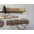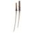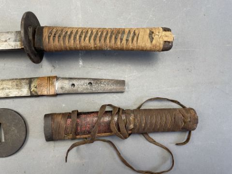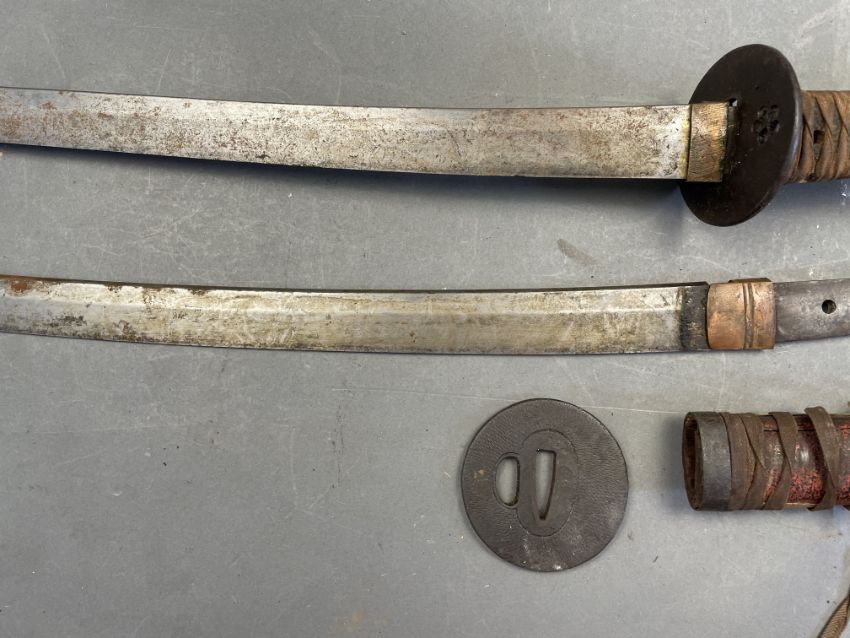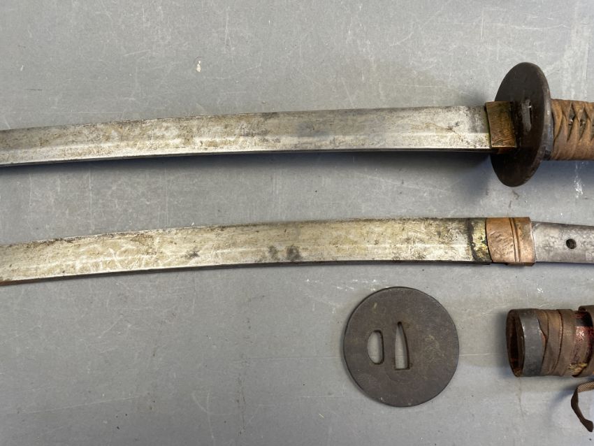 the first: Sugata (configuration): shinogi-zukuri (longitudinal ridgeline) with shallow torii-zori (even curve), medium kissaki (tip of blade); kitae (forging pattern) details obscured by rubbing; hamon (tempering pattern) details obscured by rubbing, copper habaki (collar); nakago (tang) two mekugi-ana (peg holes), suriage (shortened), signed omote (outer face of nakago) Sagami (no) Kami Fujiwara…, ura (inner face of nakago) Echizen Ju… Koshirae (mounting): saya (scabbard) missing; tsuka (handle) wooden wrapped in brown leather over mottled red and black lacquer; with an associated plain iron tsuba (hand guard) with hammered surface and one hitsu-ana (opening for scabbard side blade) the second: Sugata (configuration): shinogi-zukuri (longitudinal ridgeline) with shallow torii-zori (even curve), medium kissaki (tip of blade); kitae (forging pattern) details obscured by rubbing; hamon (tempering pattern) details obscured by rubbing, silvered copper habaki (collar); tsuka (handle); wooden wrapped in samegawa (ray skin) and brown silk braiding Koshirae (mounting): saya (scabbard) missing