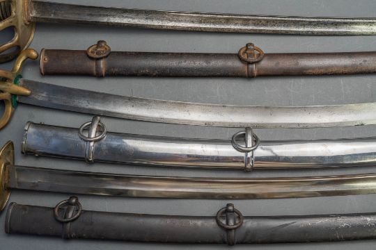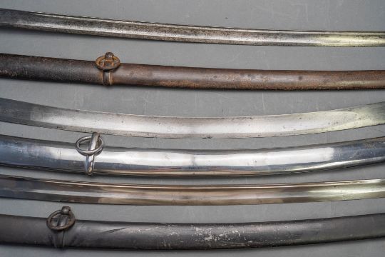 Of regulation type, the first with curved fullered blade, brass hilt stamped with inspectors marks (rubbed) and wire-bound grip (loose), in its scabbard; the second in its scabbard, complete with leather sword knot and the third with curved blade struck with a rabbit’s head mark at the forte, brass hilt, in its scabbard, the first: 97.3 cm blade (3)