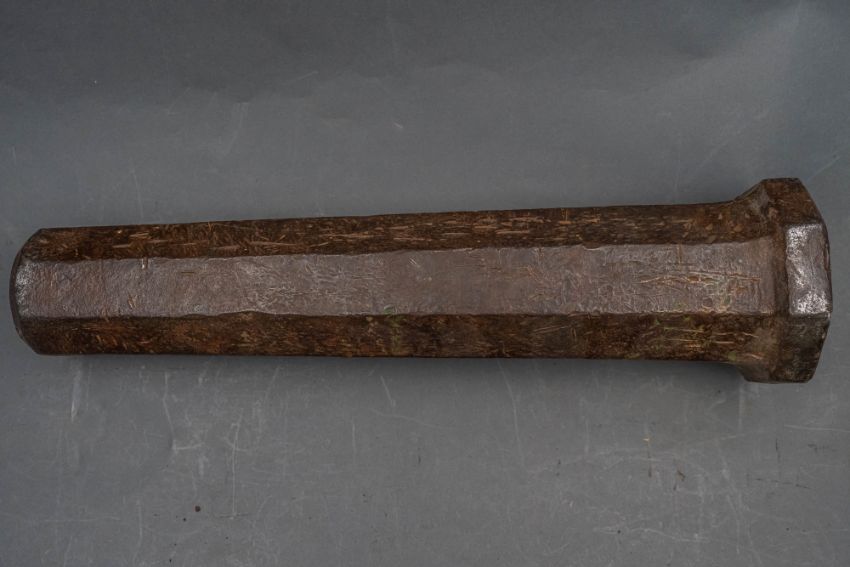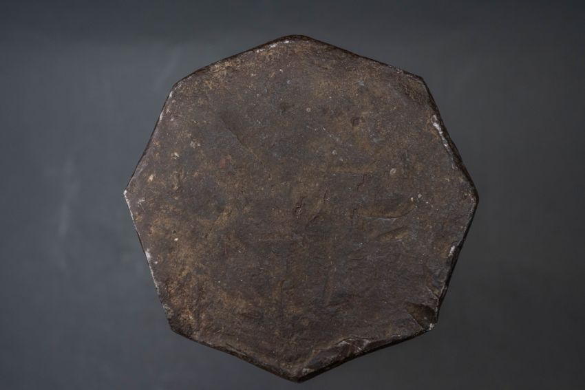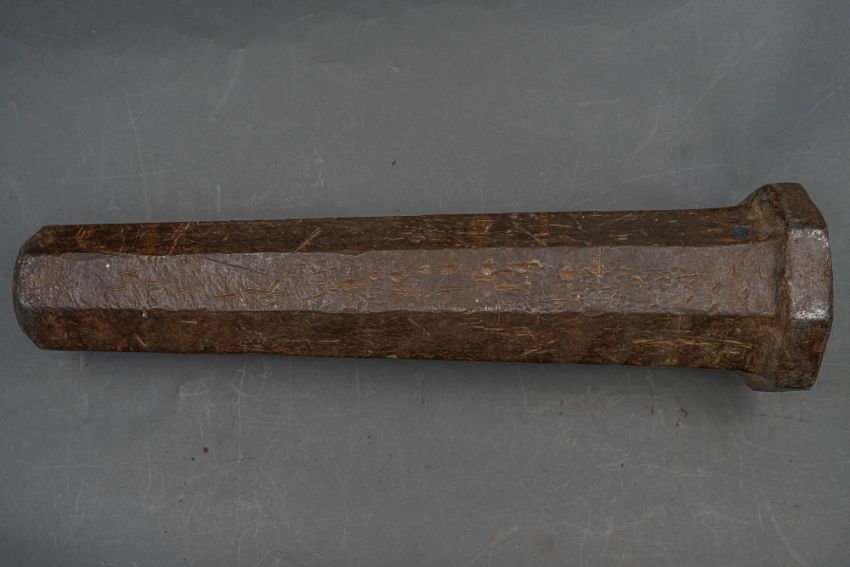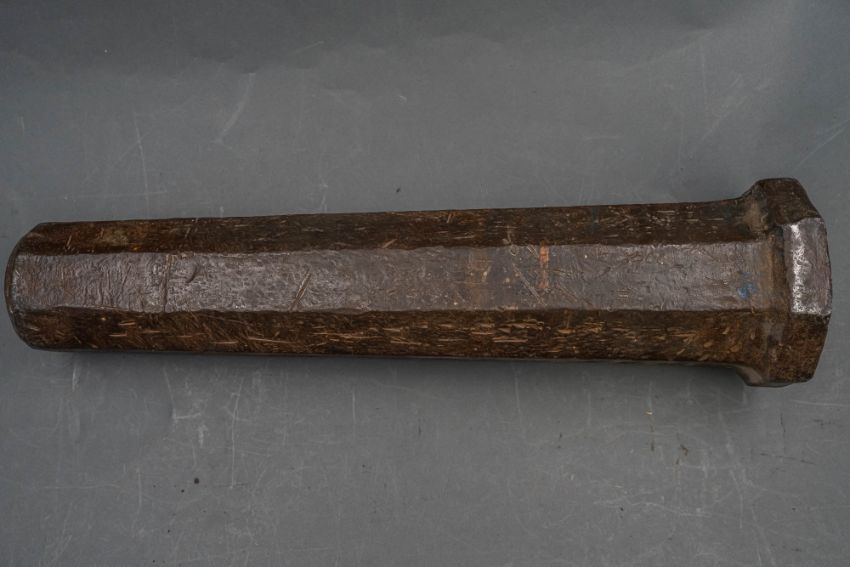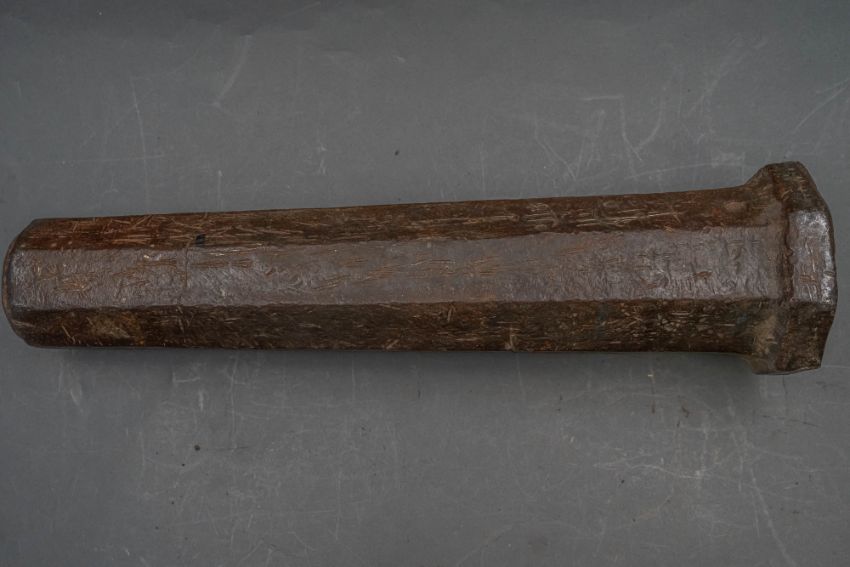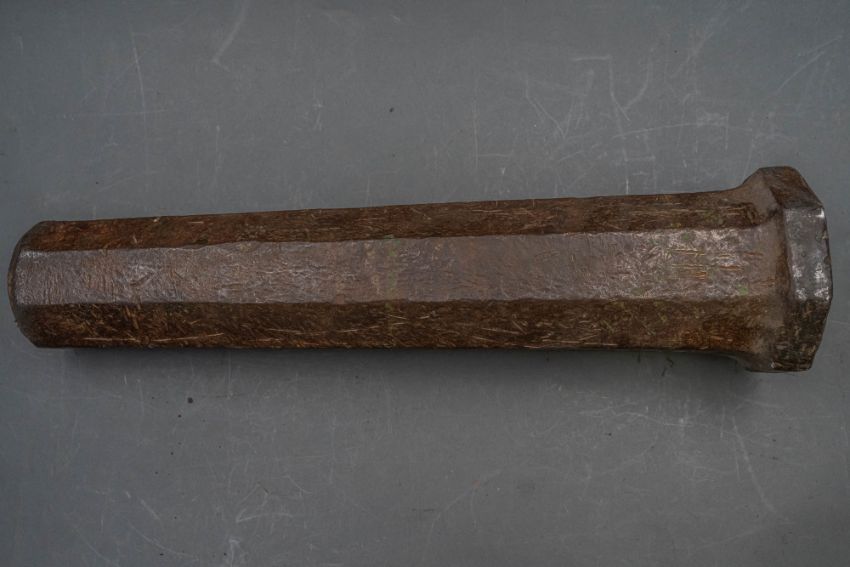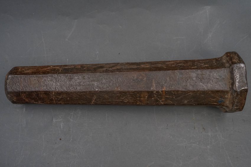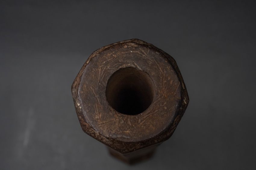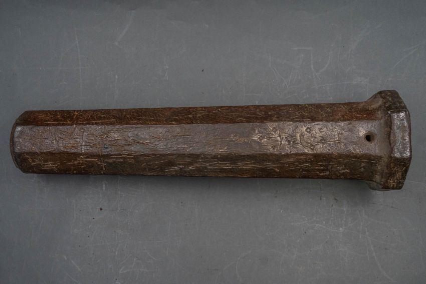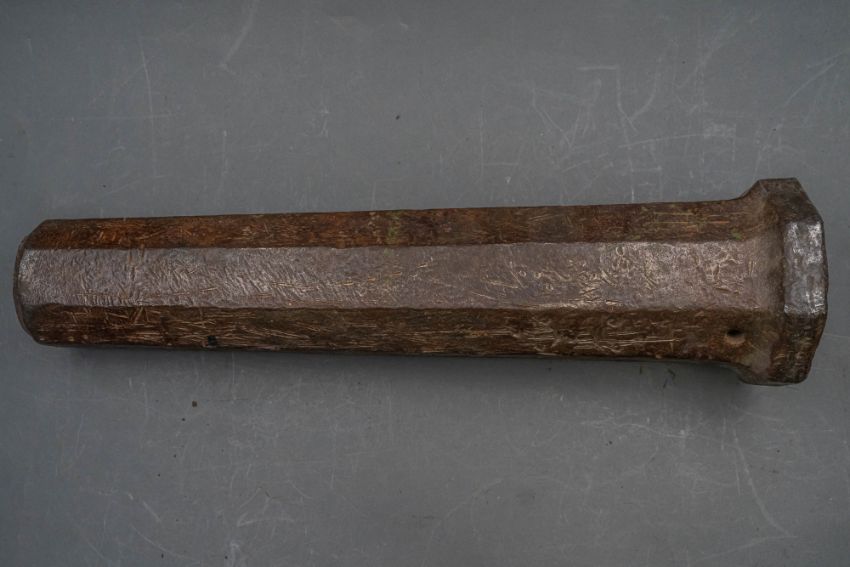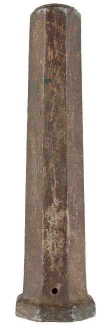 with tapering octagonal barrel formed with a narrow bevel around the muzzle, strongly moulded base-ring, pierced vent, and in aged (dented) condition, 42.7 cm overall