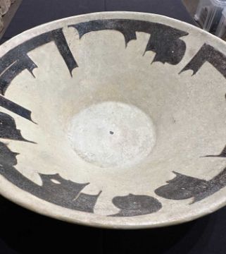 Broken and repaired in several places with extensive repainting to rim and body. Slight irridescence .