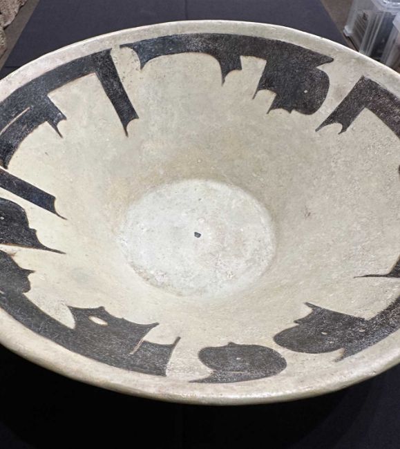 slip painted earthenware, of conical form, on shallow rim foot, decorated with kufic inscription in manganese, 32.4cm diam.