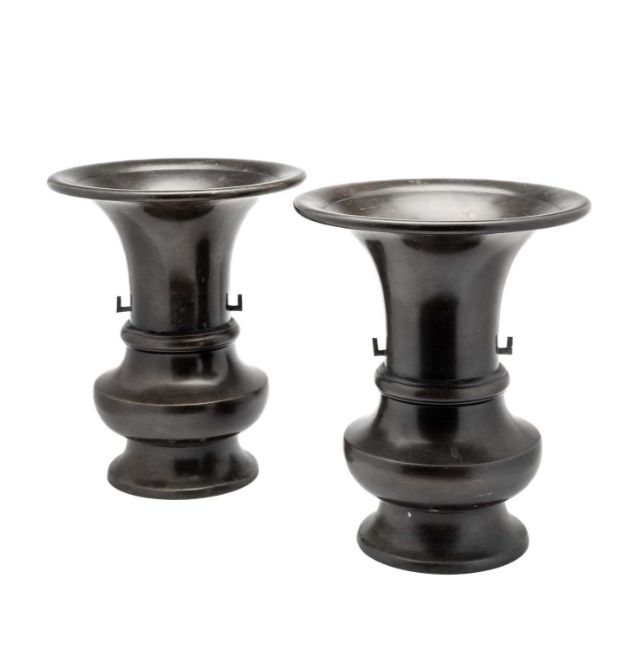 The vases have lost their handles and have minor scratches and rubbing to the patina, but are otherwise in good condition.