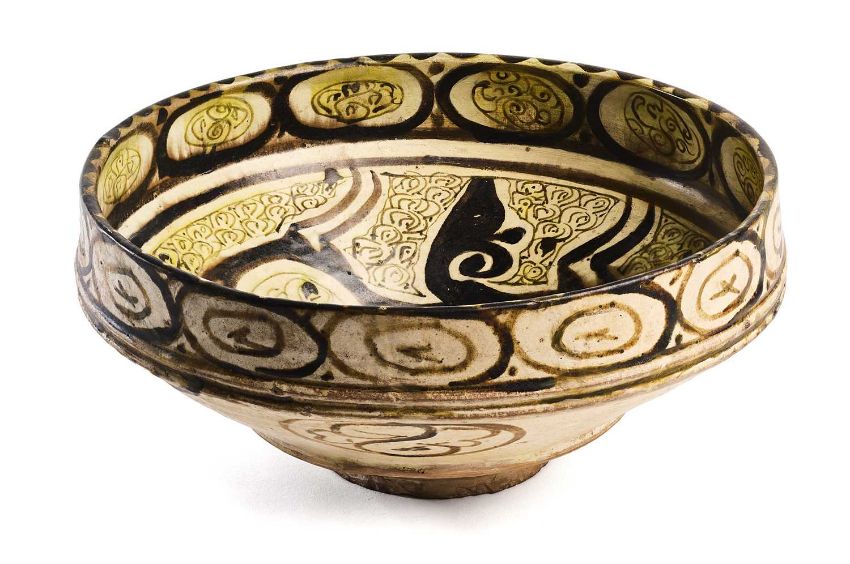 the conical body with vertical upper sides, the interior painted with a stylised antelope amidst random scrolls, arabesques and semi abstract medallions, the exterior with repeated scrolls, 29cm diam. 13cm high