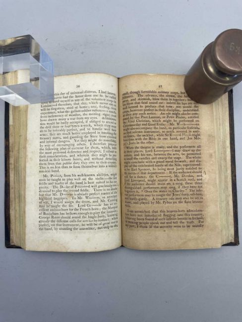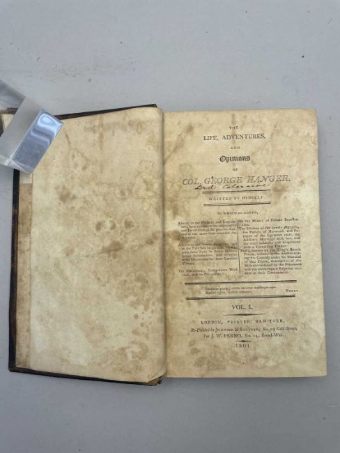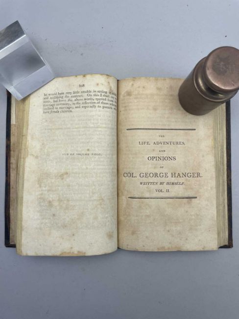 The Life Adventures and Opinions of Colonel George Hanger, two volumes in one, New York edition, 1801, 206 pages (stained with some foxing, edges of spine worn, some further wear to edges of cover)