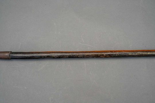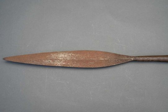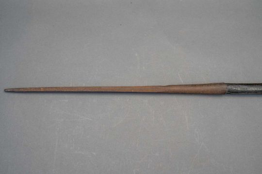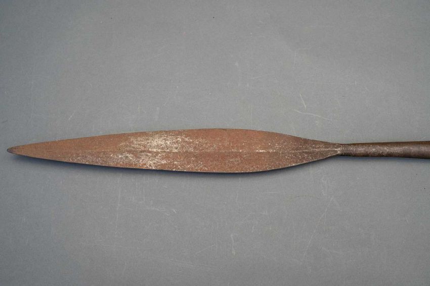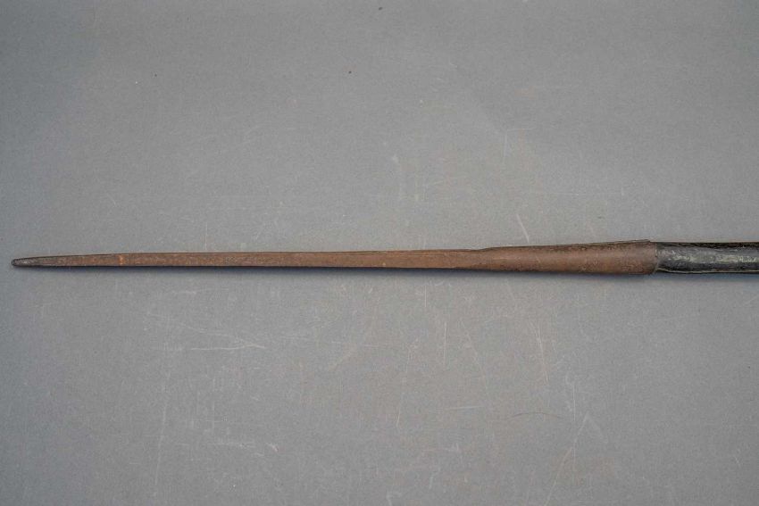 with leaf-shaped blade, tapering socket decorated with incised ornament, on its wooden haft with spiked basal finial, 49.5 cm head