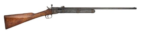 with sighted barrel with the retailer's details in gold letters along the top in front of the adjustable back-sight, the breech stamped 'Acier' and numbered on one side, engraved blued action with manufacturer's logo in front of the loading port, threaded gas cylinder mounted beneath the barrel, butt with dark hard-rubber butt-plate, engraved blued trigger-guard, and adjustable trigger (areas of pitting and wear), 62.5 cm barrel