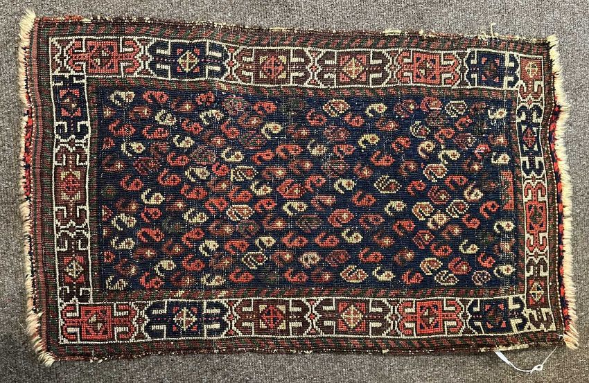 Luri: good pile,approx 8mm, secured ends; Afshar: good pile, glassy wool, some evidence of old moth damage, small holes and restorations, pretty; Beluch: Pile fair, some slight wear with knotheads visible, losses to end finishes