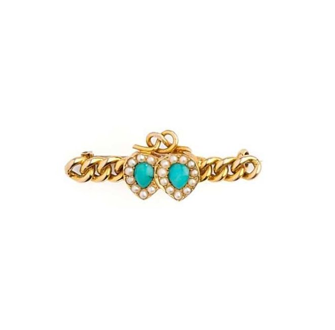 centring on a pair of entwined hearts set with turquoise cabochons framed by seed pearls, applioed to a curb link bar, 3cm long