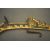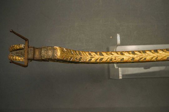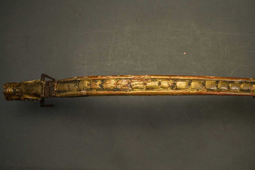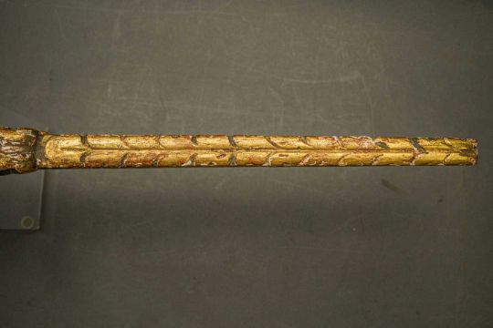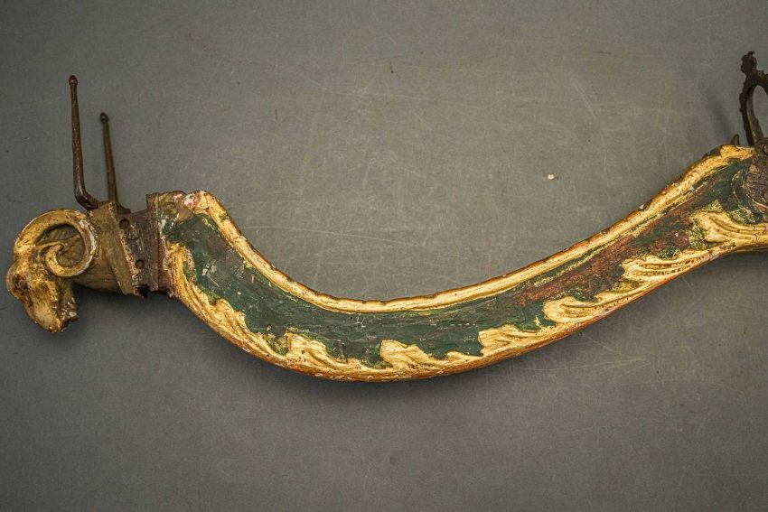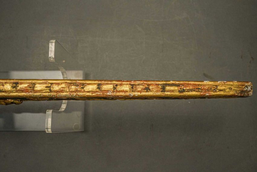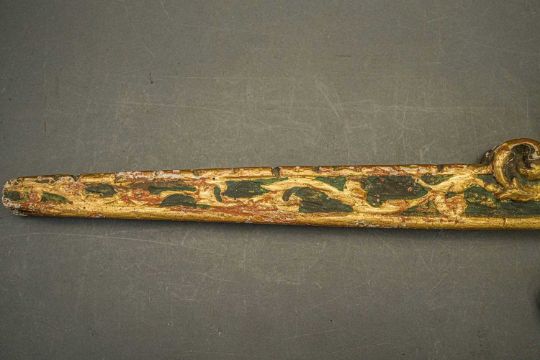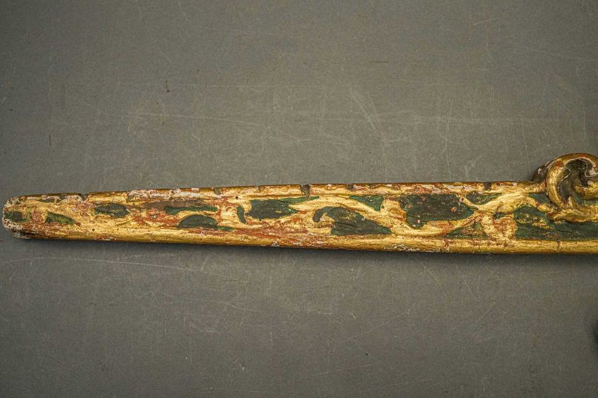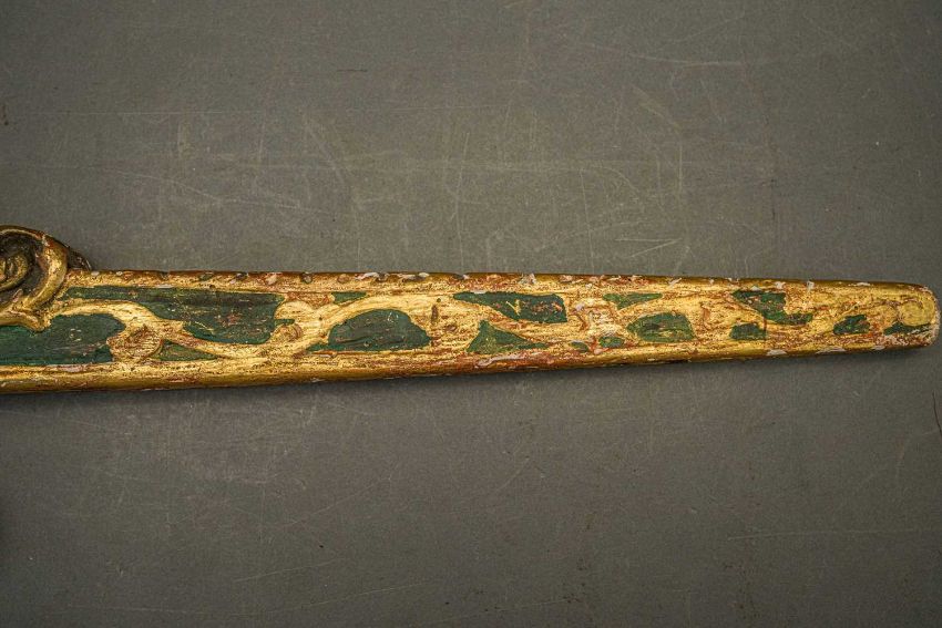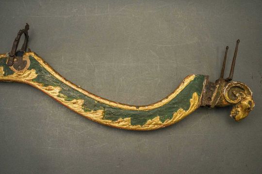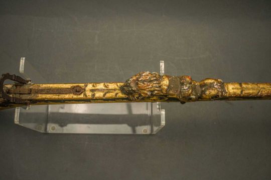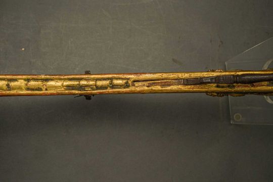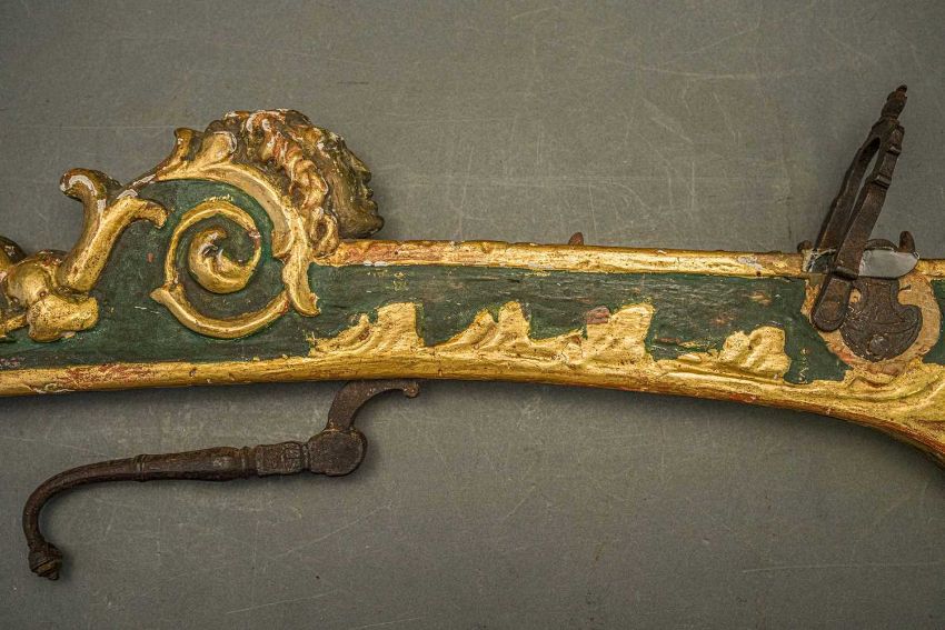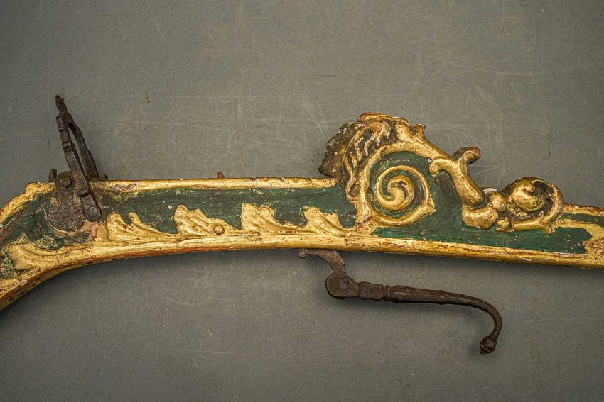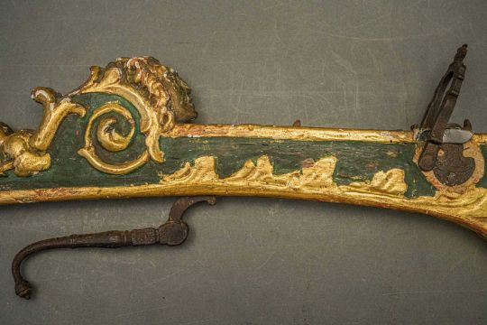 of characteristic form, carved over the top, bottom and its lower edge with foliage in low relief, a rams-head in the round at the front, an elaborate scroll involving a mask in the centre, fitted with associated iron fore-sight, moulded trigger (wormed, restorations), and decorated throughout with later green paint highlighted with gold, 98.0 cm overall