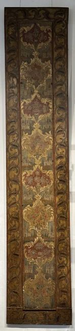 each of long rectangular form with central panel decorated in low relief with a series of 'rococo' floral cartoush, with depictions of various buildings in the background, surrounded by a scrolling arabesque boarder, 269 x 55 x 3.5cm approx.; 273 x 57 x 3.5cm approx.