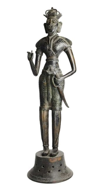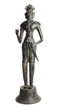 This is possibly a figure of King Vikrama Rajasinha (1798-1815), For a related bronze figure in the Norton Simon Museum, Pasadena, see inv. no. P.2002.05.2. Vikrama Rajasinha was the last in the line of Kandyan Kings, deposed by the British who had exploited divisions within the court. He was imprisoned in South India where he died fifteen years later.