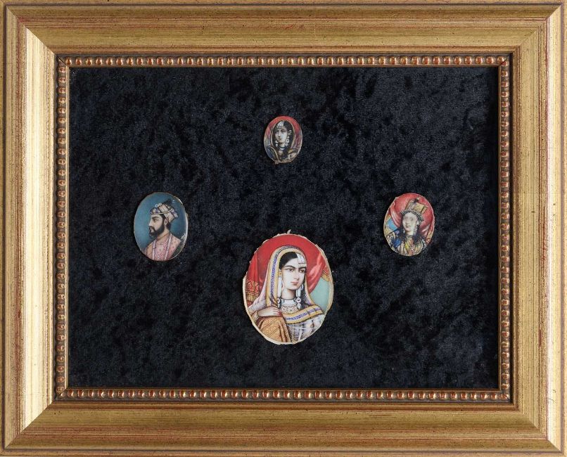 gouache on ivory, one depicting an emperor, probably Shah Jahan, the others probably Noor Jahan and Mumtaz Mahal, mounted and framed together, 5 x 4cm and smaller