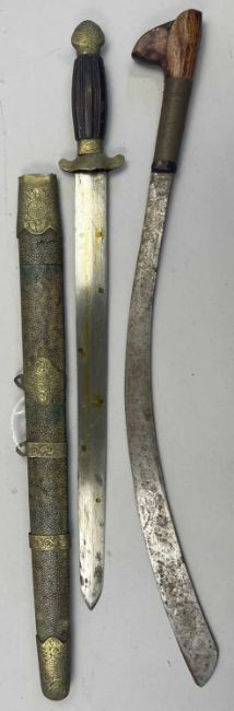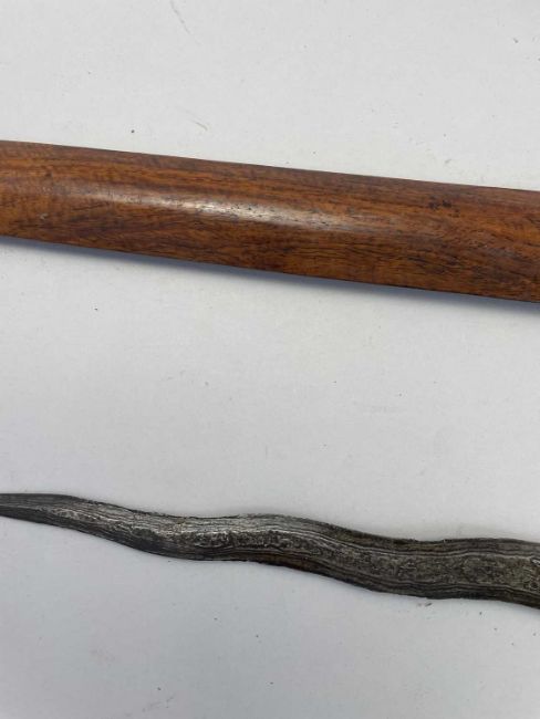 the first with double-edged blade inlaid with brass rondels, engraved brass hilt decorated with traditional designs, in its fishskin-covered wooden scabbard with brass mounts en suite; the second a Moro kris, with pattern-welded straight double-edged blade, white metal hilt, grip bound with white metal and rattan, in its scabbard; the third a Sulawesi kris, with pattern welded wavy blade, carved hilt with beaked pommel, in its scabbard; and the fourth with curved blade, and carved wooden hilt, the first: 40.5 cm blade (4)
