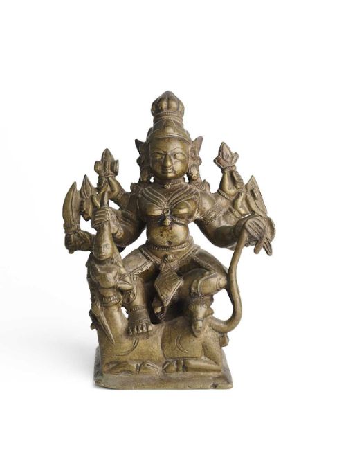 the eight-armed goddess holding the tail and the emerging head of the demon in her primary hands, wielding various weapons and attributes in her upper hands, wearing earrings and tall headdress with bud finial, 11cm high