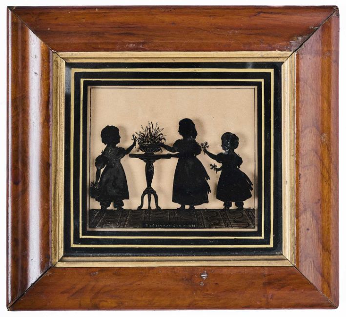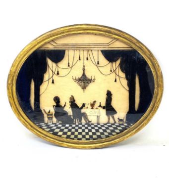 rectangular glass painted with an interior scene of three children arranging flowers in a bowl on a tripod table, titled lower middle, 25.5cm long including rosewood moulded frame; together with another Silhouette picture, in 18th century style, the oval glass painted probably by an amateur hand circa 1900 with a curtained interior scene of a seated lady and gentleman smoking a pipe while a footman brings a decanter accompanied by a cat, 44cm long including giltwood frame (2)