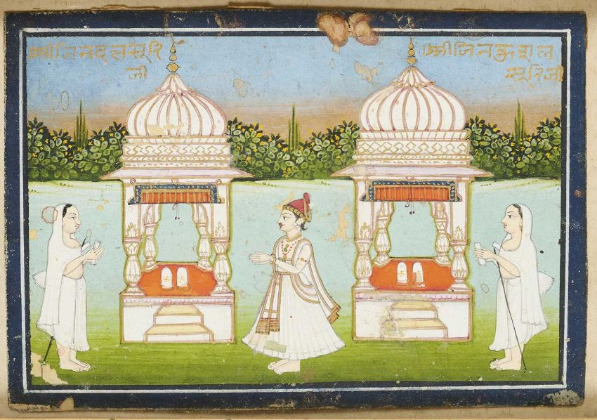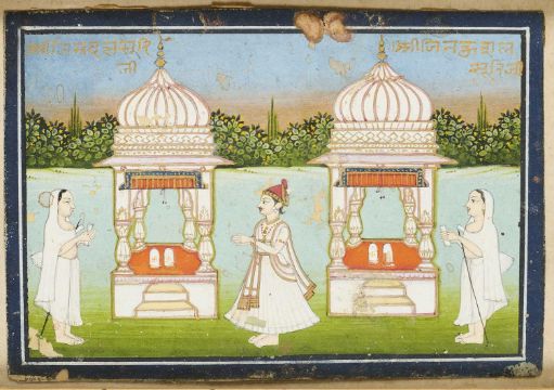 gouache with gold on paper, the two Mughal style pavilions attended by devotees in a verdant setting with a forest in the background, each labelled in gold devanagari, framed, 7.5 x 11.5cm