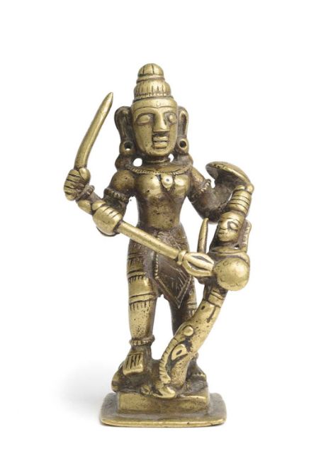 on stepped square base, the four-armed goddess spearing the demon with her trident as it emerges from the buffalo's mouth, 11.5cm
