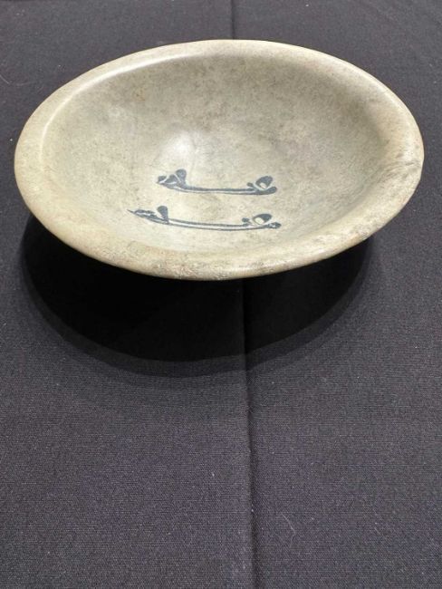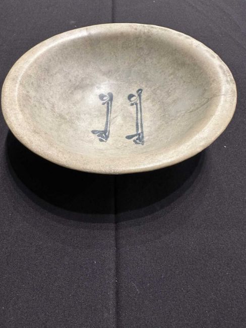 of rounded form with everted rim on shallow foot, with two lines of inscription in cobalt blue on opacified tin glaze ground, 5.5cm high; 19.5cm diam.