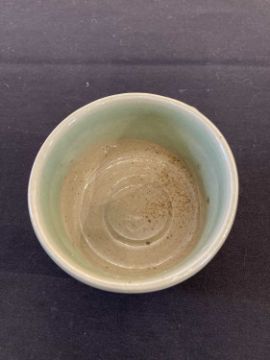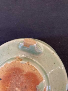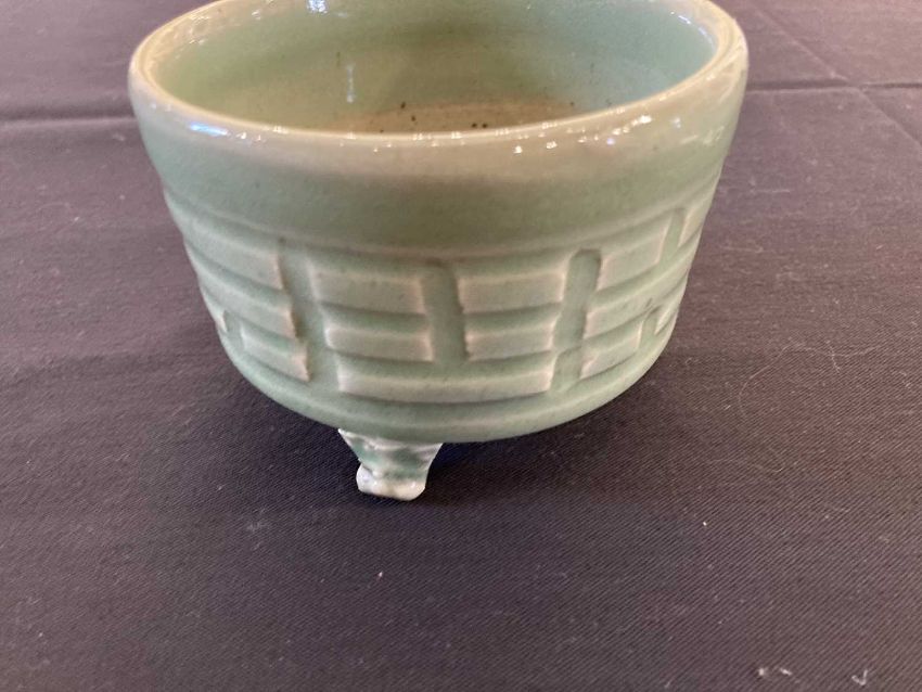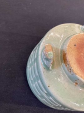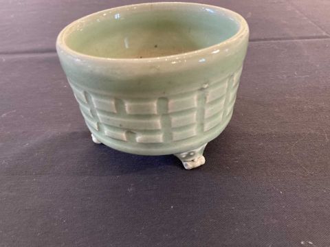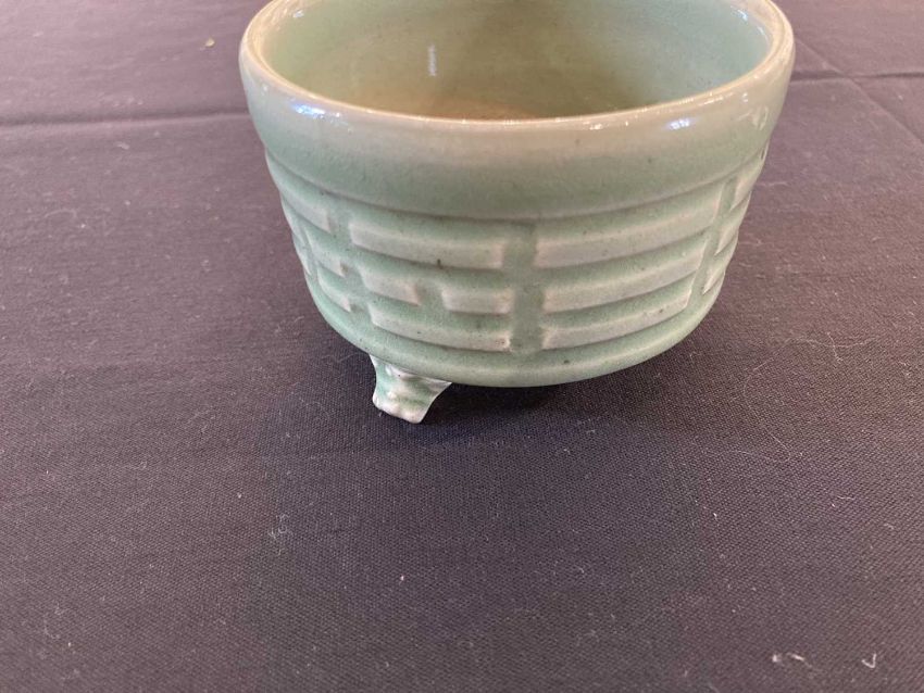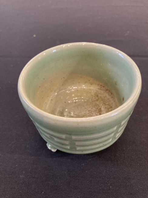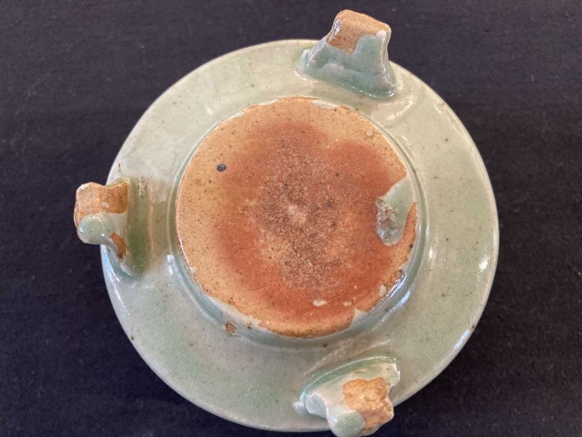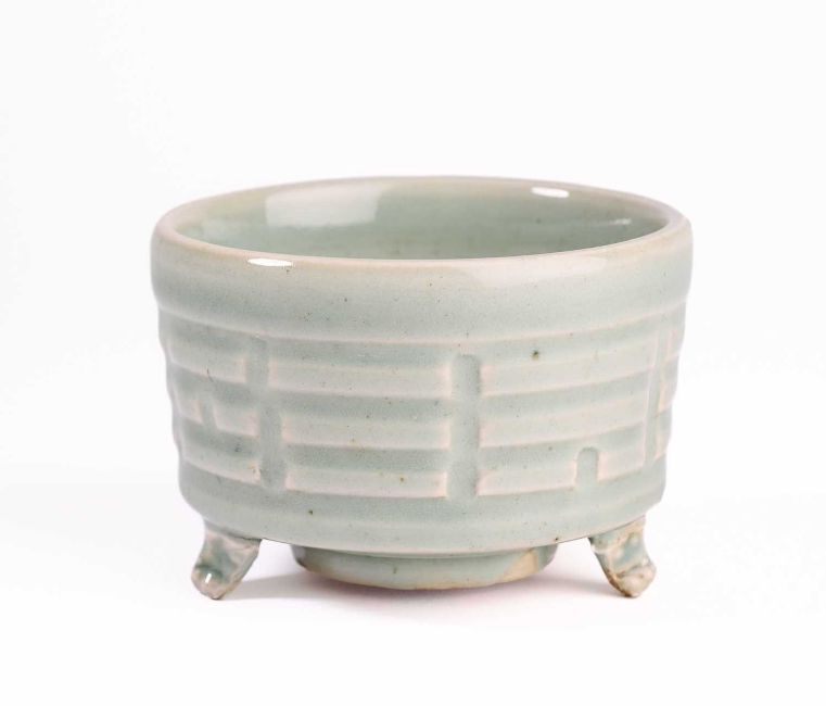 of archaistic lian form, the deep sides rising from a tapering circular foot on the base, all supported on three cabriole legs, decorated around the exterior in relief with the 'Eight Trigrams' between two raised fillets, covered overall with an attractive lustrous sea-green glaze, save for the foot ring left unglazed revealing the body burnt russet-orange during the firing, 9.5cm diameter