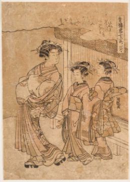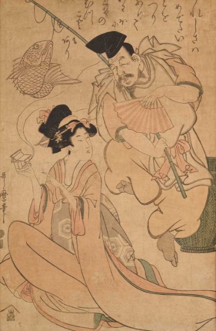 comprising: Utagawa Yoshitora, active 1836-80, vertical oban, from the series ‘Six Immortal Poets’, mounted, image 33 by 22cm; Isoda Koryusai, 1735-1790, depicting three maidens, mounted, image 26 by 19cm; Kitagawa Utamaro (1753-1806), a book plate depicting three maidens, mounted, image 23 by 15.5cm; Kitagawa Utamaro, a vertical oban, Ebisu and a maiden, mounted, image 35.5 by 23.5cm, Kitagawa Utamaro, vertical oban, a courtesan, mounted, image 35.5 by 23cm, Kikugawa Eizan, vertical oban, a standing lady with a letter, mounted, image 35 by 23cm